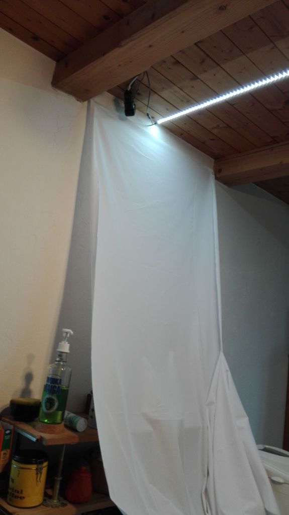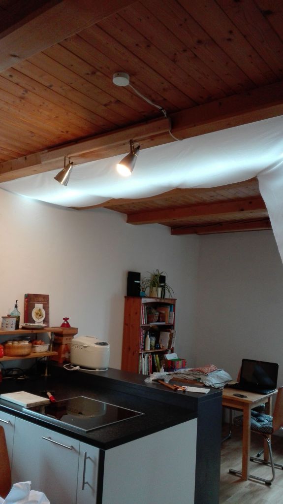 Da wir gerne recyceln, selbst kreativ sind und nicht gern viel Geld ausgeben, wurde die Deckenleuchte ein DIY-Projekt. Wir mussten an der Decke einige unschöne Stellen verstecken, das Holz hatte dort Flecken und zwei Ausschnitte von früheren Installationen. Um indirektes Licht, zusätzlich zu den Spots in der Küche zu haben, und die Stellen zu kaschieren, haben wir einen LED-Strip an die Decke geklebt, darüber mit Haken und Ösen eine Stoffbahn in Weiß montiert.