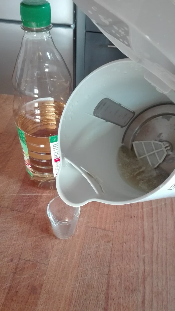 Das aller leichteste Vorhaben hier, ist das Entkalken mit Essig. Jeder Essig, am besten ein besonders günstiger, ist geeignet, ich hebe den Entkalker-Essig bei den Reinigungsmitteln auf. Ich hatte noch einen in einer Plastikflasche, verwende aber jetzt nur mehr Essig aus Glasflaschen. Der Plastik-Vermeid-Hype hat mich voll erwischt und es fühlt sich falsch an, noch irgendwas in Plastik zu kaufen.