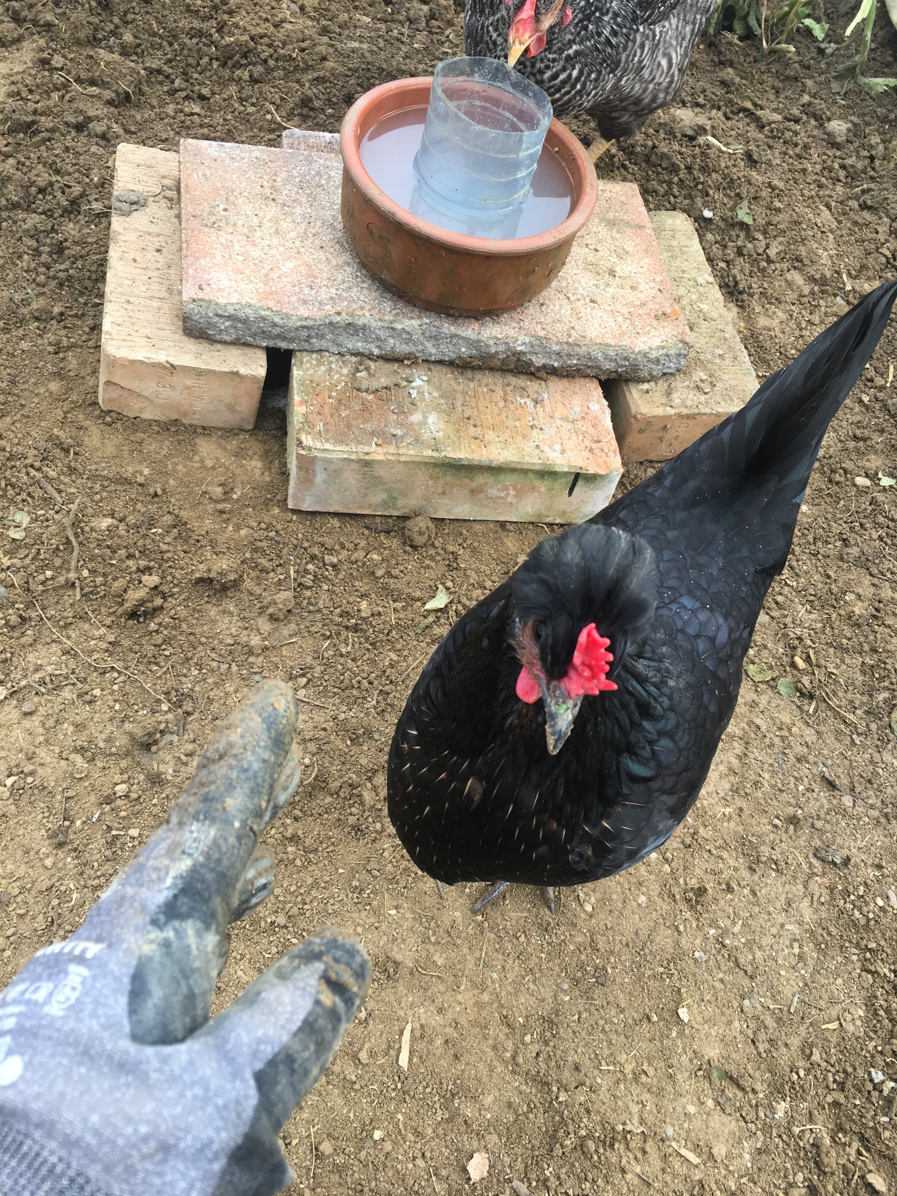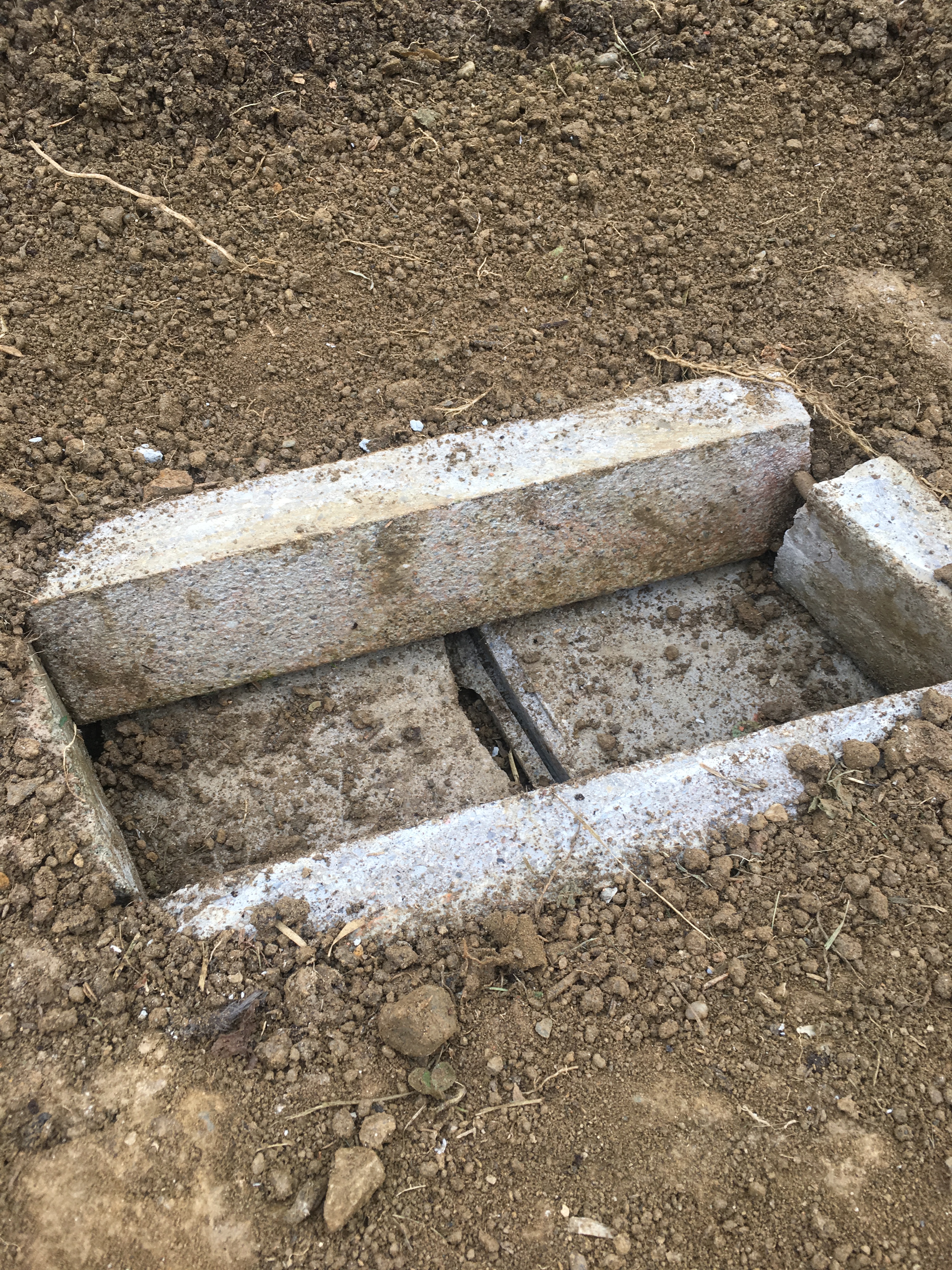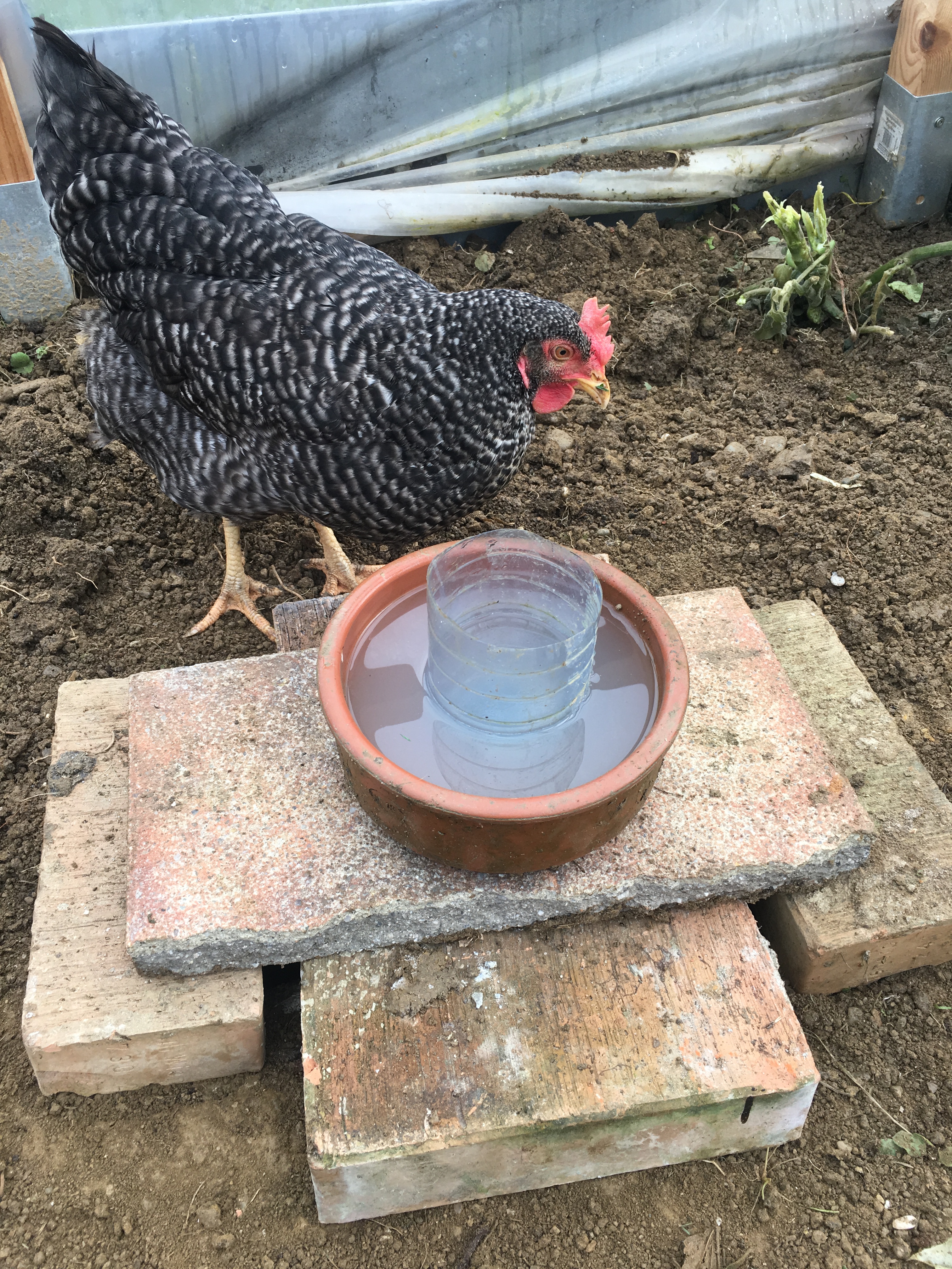 Wir brauchen also eine beheizbare Hühnertränke. Ja, es gibt welche zu kaufen, mit Strom beheizbare Platten zum Beispiel und ja wir haben jetzt Strom im Folientunnel, aber ich will aus Prinzip nichts kaufen, wenn es auch anders geht. Nach einigem Überlegen habe ich eine kleine Grube ausgehoben und Plattenreste, übrig geblieben vom Terrassenprojekt in den Folientunnel getragen.