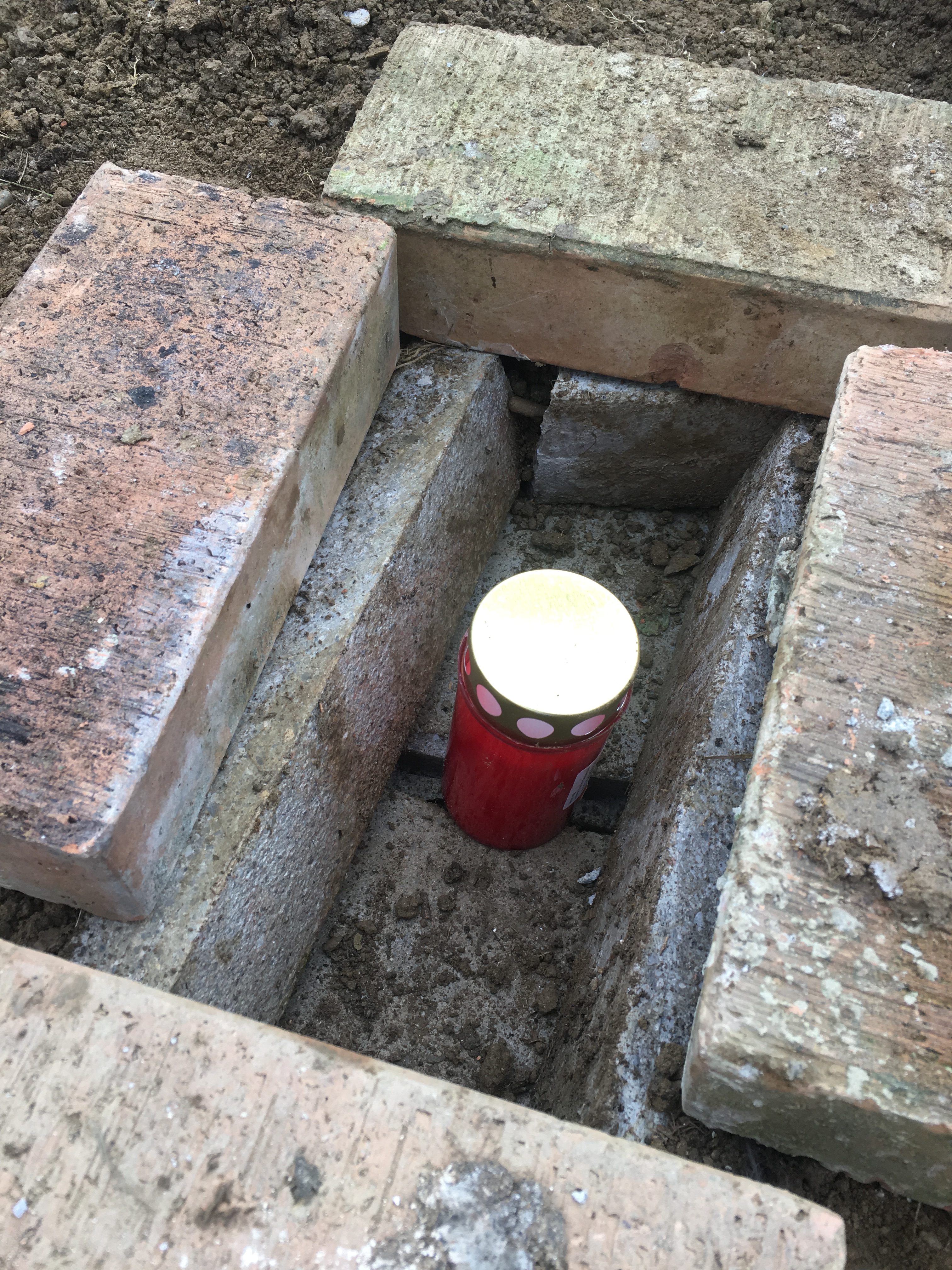 In die Grube habe ich Plattenstücke gelegt, um darauf dann eine Kerze mit langer Brenndauer (z.B. Grablicht) zu platzieren. Als Abdeckung dient ein weiteres Stück einer Terrassenplatte und darauf stelle ich dann die Tränke. Um mehr Raum zu schaffen habe ich die Abdeckung noch auf Ziegel gestellt.