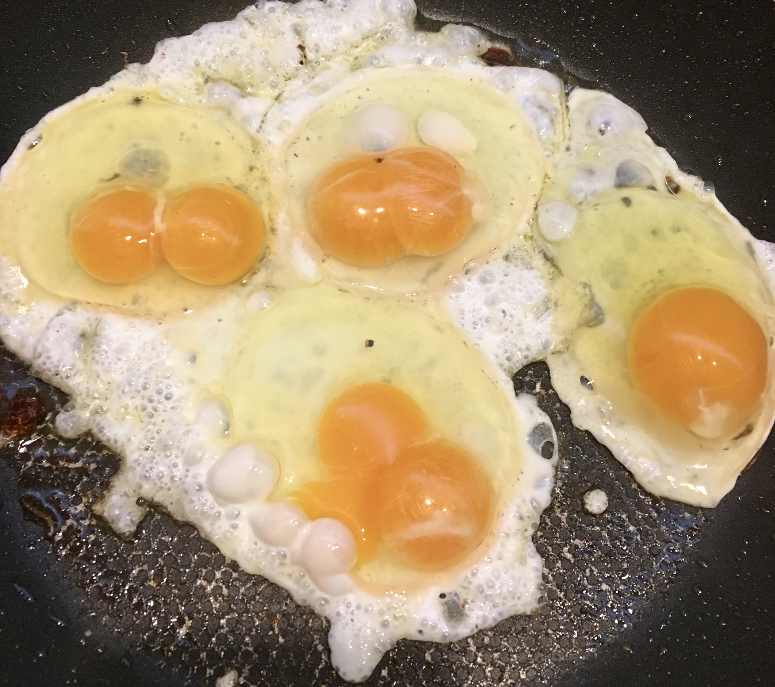 Wir haben durchschnittlich 3-4 Eier täglich (zu den verschiedensten Tageszeiten) und das im tiefsten Winter. Die Dotter sind dunkelgelb und oft sind 2 oder sogar drei Dotter in einem Ei.