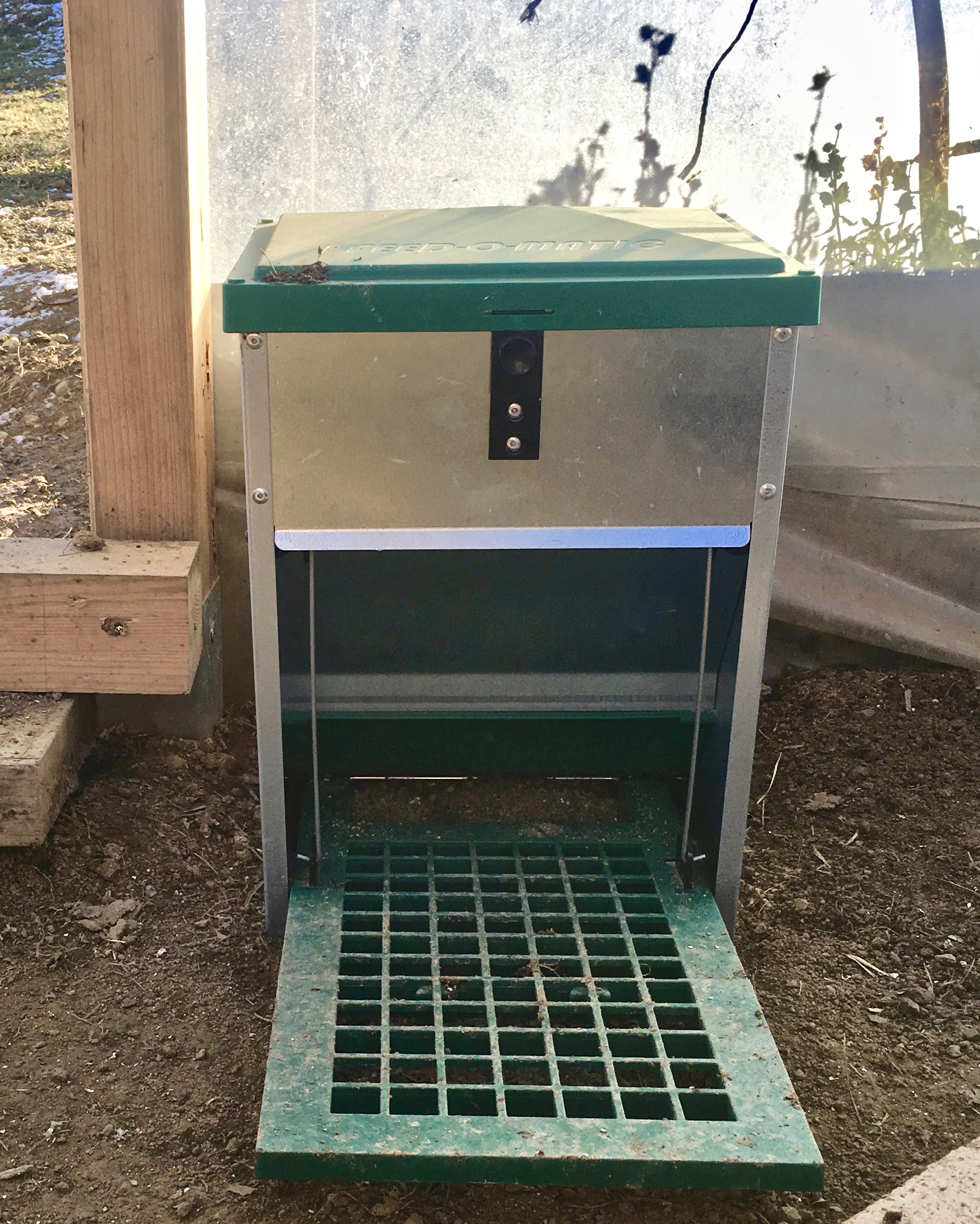 Die zweite größere Investition war ein Tritt-Futterautomat. Vor einigen Wochen haben wir bemerkt, dass Mäuse im Folientunnel Feste feiern. Wir fanden mehrere Löcher, die Hühner haben zweimal (!) eine Maus gefangen (keine Ahnung wie sie das angestellt haben), Mäusekot war im Gefäß mit den zerkleinerten Eierschalen und ich bin sicher, die Mäuse haben sich am Hühnerfutter satt gefressen 😀