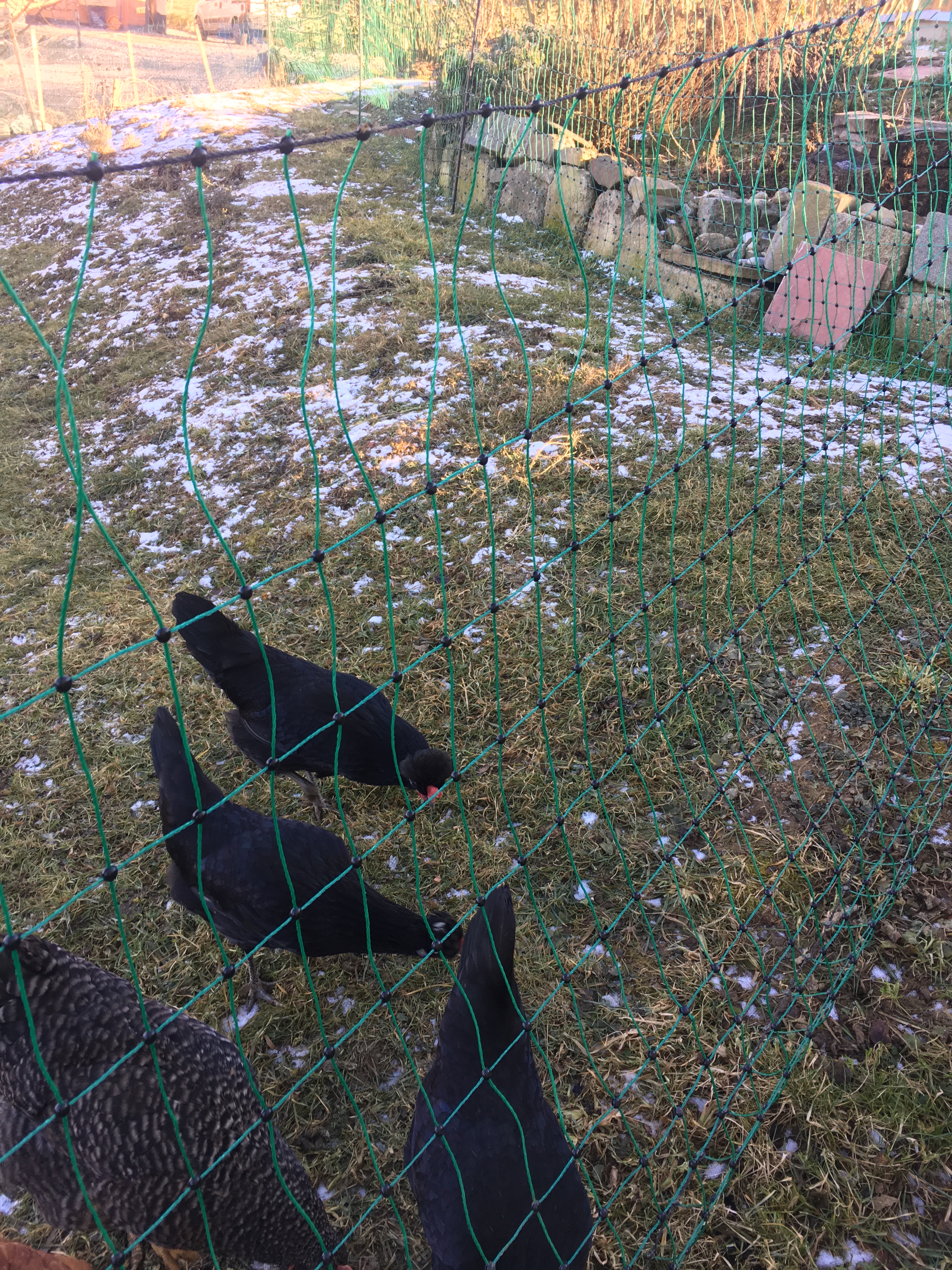 Der mobile Maschenzaun lässt sich sehr schnell umstecken (ausser die Erde ist gefroren, wie gerade jetzt im Januar) und um ins Gehege zu gelangen drückt man/frau den Zaun runter und steigt drüber – einfach. Im Frühjahr plane ich, die Hühner in den Gemüsegarten zu lassen, dort können sie umgraben, düngen und Schnecken und anderes Insektenzeug fressen.