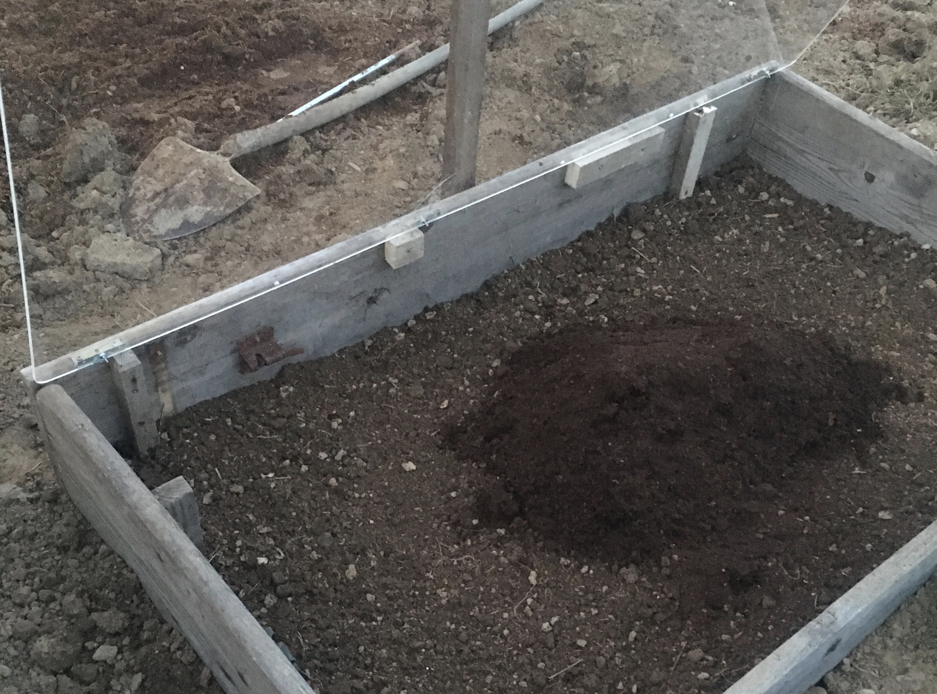 Nachdem wir den Rahmen in unseren Gemüsegarten getragen haben, musste ich innerhalb des Rahmens mehr Raum schaffen um den Pferdemist reinpacken zu können. Ich habe also circa 25 cm tief Erde ausgehoben. Da rein kamen Mist, feine Gartenerde und ein Rest Blumenerde vom letzten Jahr.