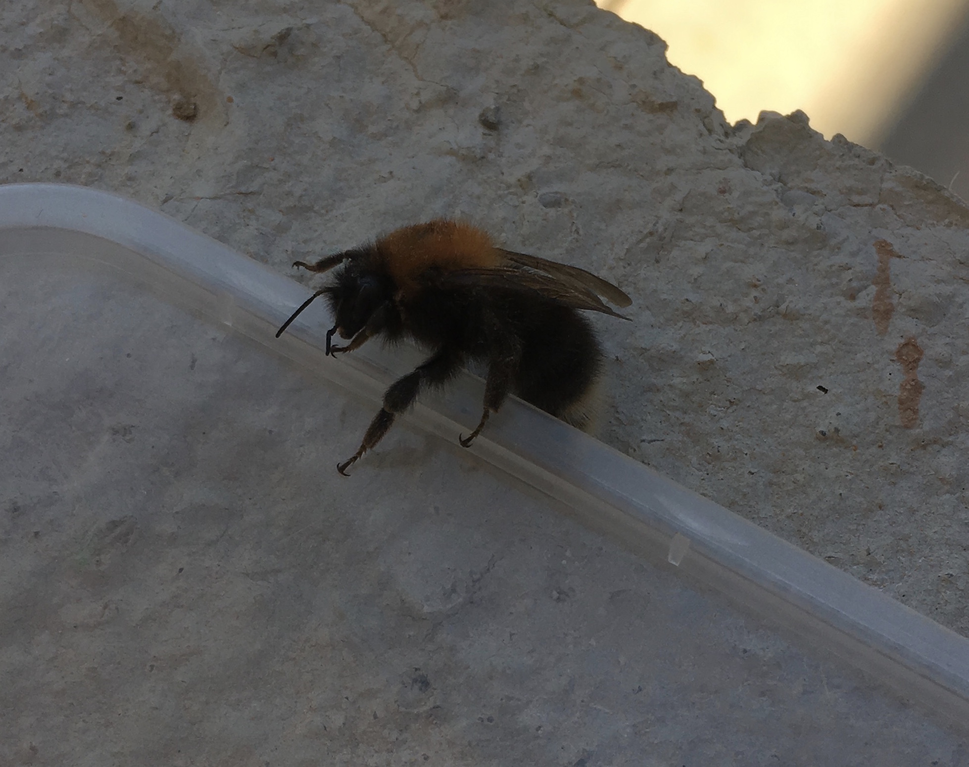 Wir haben in unserem Haus eine Hummel gefunden, sie saß ruhig am Boden und wollte (konnte?) sich nicht bewegen. Ich weiss nicht genau, ob es eine Hummelkönigin war, die bereits bei Temperaturen ab 2 Grad fliegen, oder eine Arbeiterin die ab circa 8 Grad ausfliegen. Auf jeden Fall habe ich sie mit einem Stück Papier aufgenommen, erfolglos versucht mit Zuckerlösung zu füttern, um sie danach draussen auf die Mauer zu setzen.
