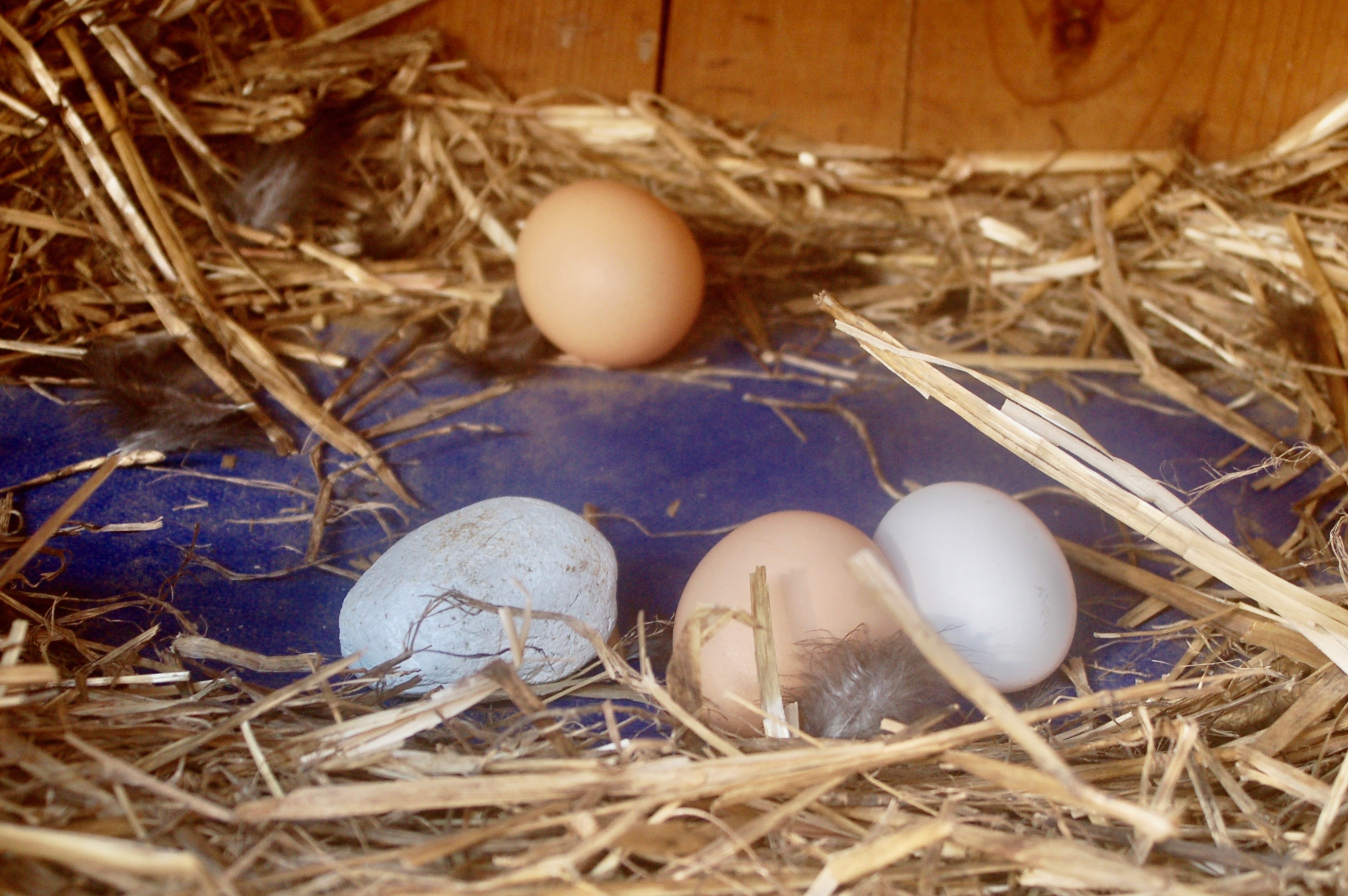 Da ich ja nichts kaufen will, was ich selber machen kann, habe ich einen Stein gesucht, der ungefähr wie ein Ei aussieht, habe ihn mit einem wasserfesten Lackstift komplett weiß angemalt und nach dem Trocknen ins Legenest gelegt.