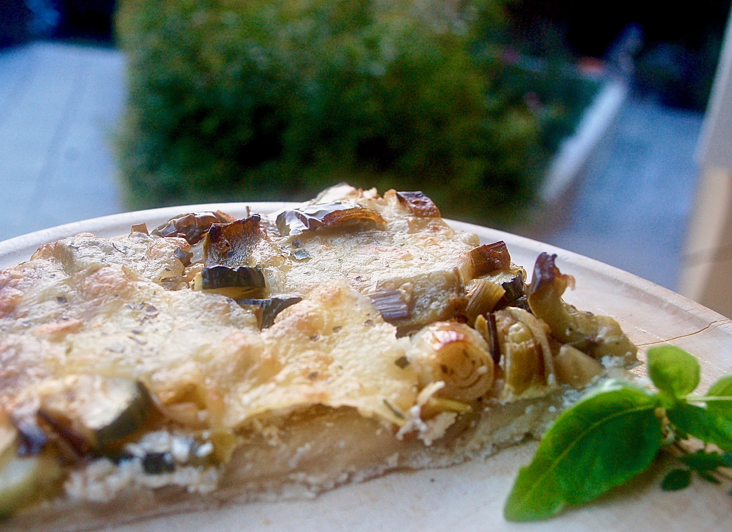 Ein wenig abkühlen lassen, dann entfaltet der Flammkuchen seinen Geschmack noch besser. Schließlich mit Oregano, Thymian oder anderen Kräutern und Chiliöl beträufelt ist dieser Flammkuchen ein Gedicht. Kalt oder warm genossen mit einem grünen Salat ist es ein ideales Sommeressen.