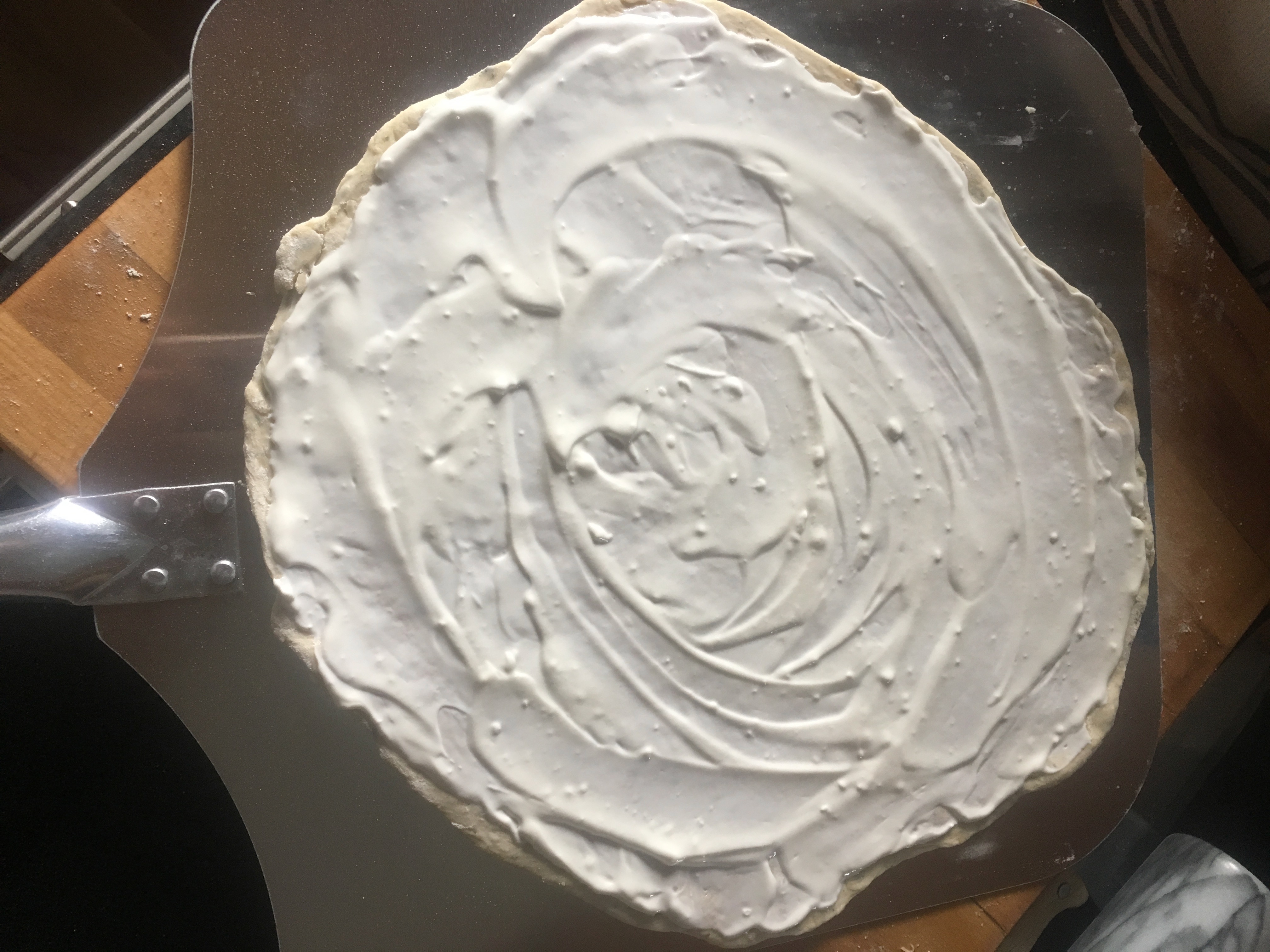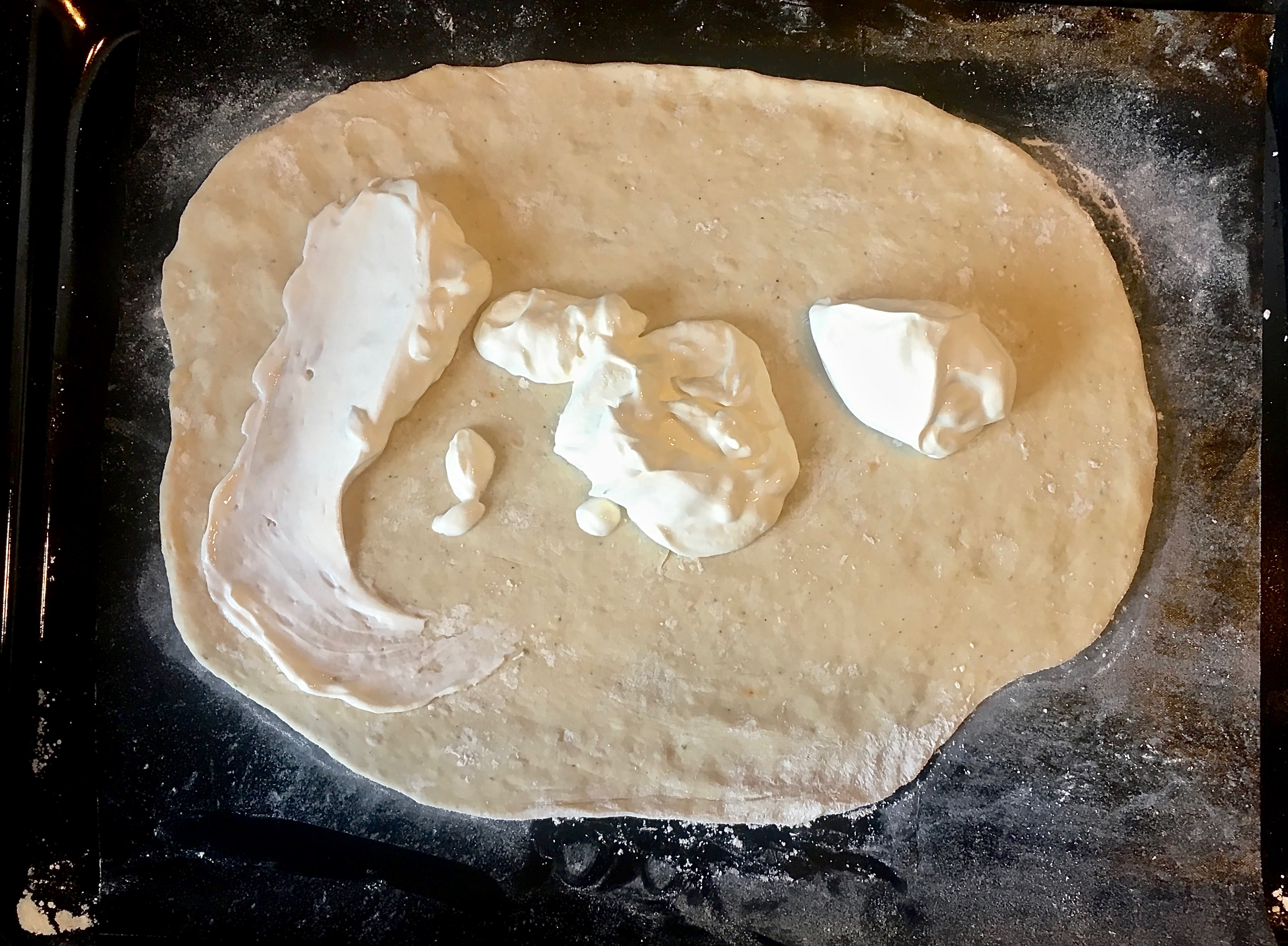 Nach dem Ausrollen den gesamten Teig bis zum Rand mit Sauerrahm bestreichen. Ich habe Schmand probiert, in vielen Rezepten wird das empfohlen, doch der leicht säuerliche Geschmack des Sauerrahms passt meiner Meinung nach viel besser zum Gemüse.