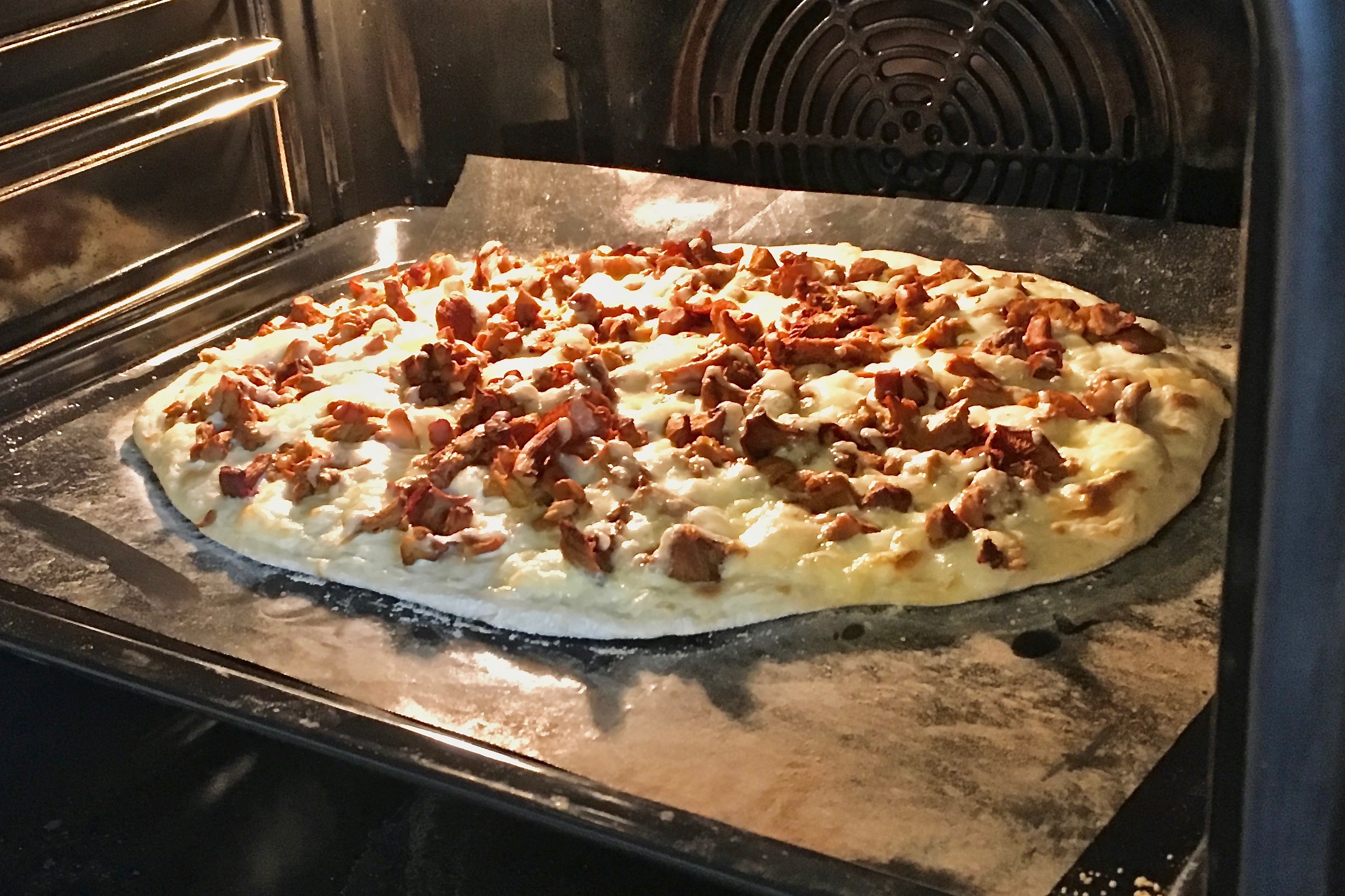 Bei 275° C Ober- und Unterhitze im Rohr ca. 20-30 Minuten backen. Falls der Teig unterhalb nicht mindestens ein bisschen gebräunt ist, noch einige Minuten im Rohr belassen, eventuell nur mit Unterhitze weiter backen.