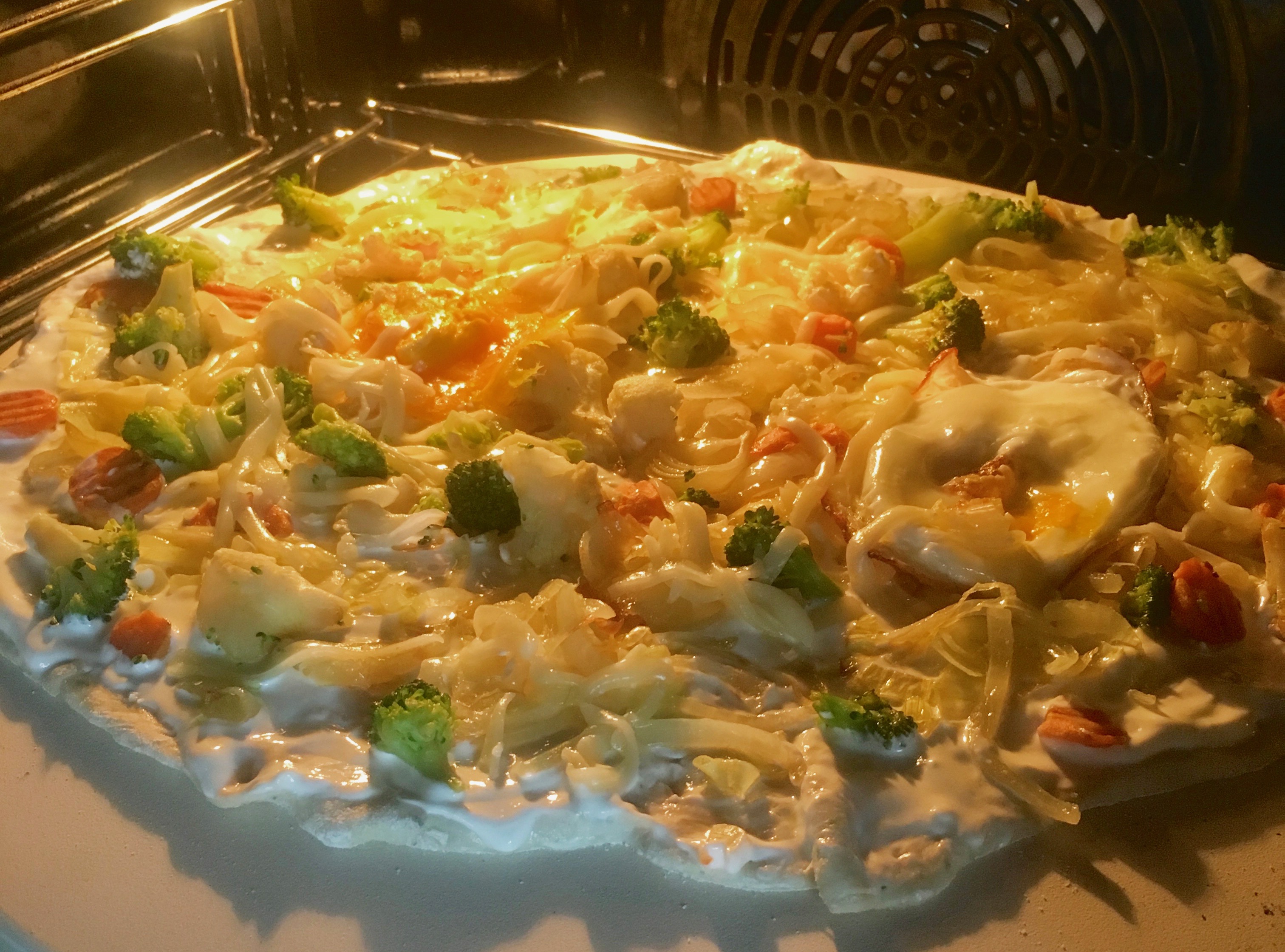 Am Schluss wird der Käse sparsam drauf verteilt. Anders als bei Pizza ist hier ja bereits ein Milchprodukt mit einem Fettgehalt vertreten, zuviel Käse würde vom Geschmack ablenken.
