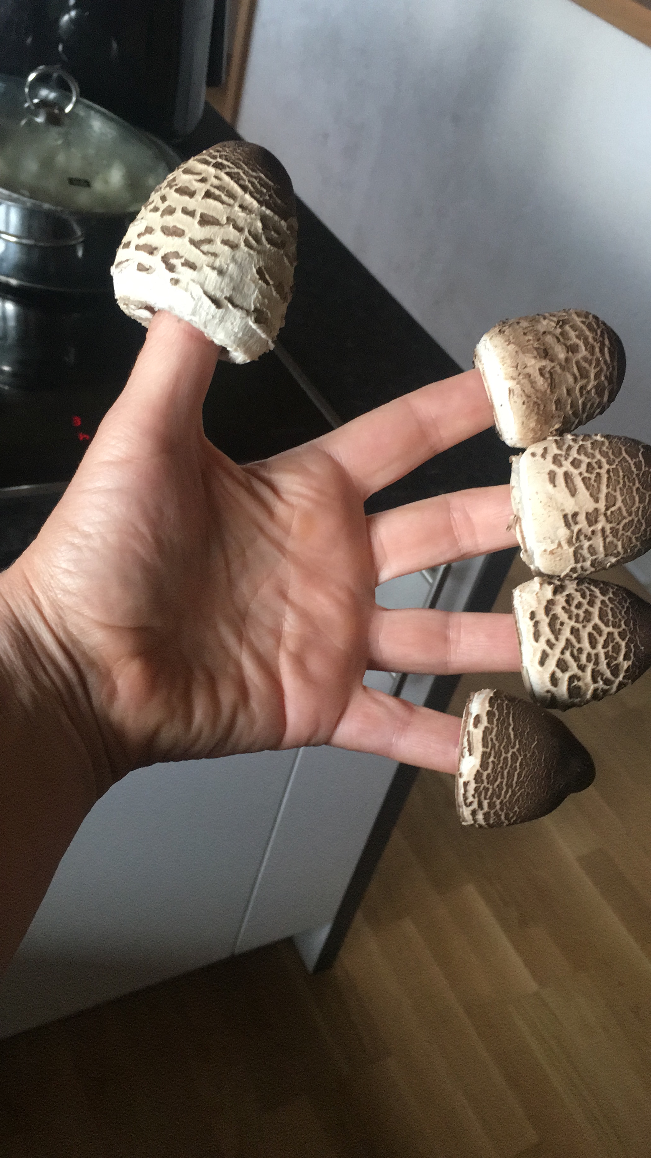 Hier seht ihr die Hüte einiger Safranschirmlinge, die etwas kleiner sind als Parasole, immer ein wenig orangefarben anlaufen und ebenfalls ausgezeichnete Speisepilze sind.
