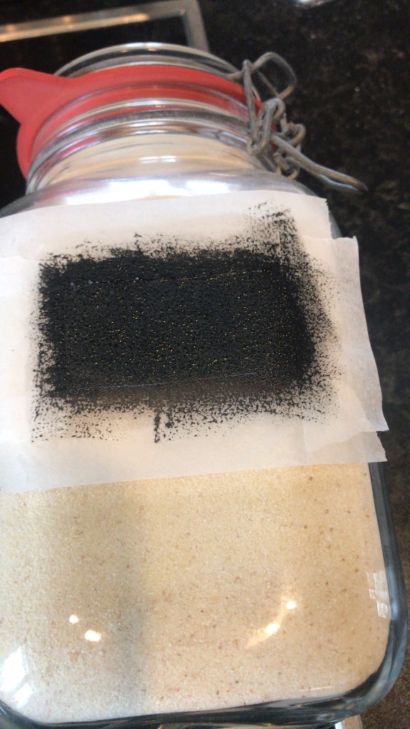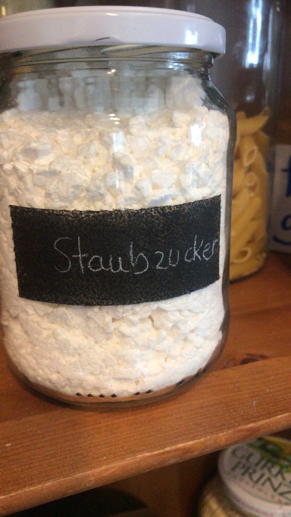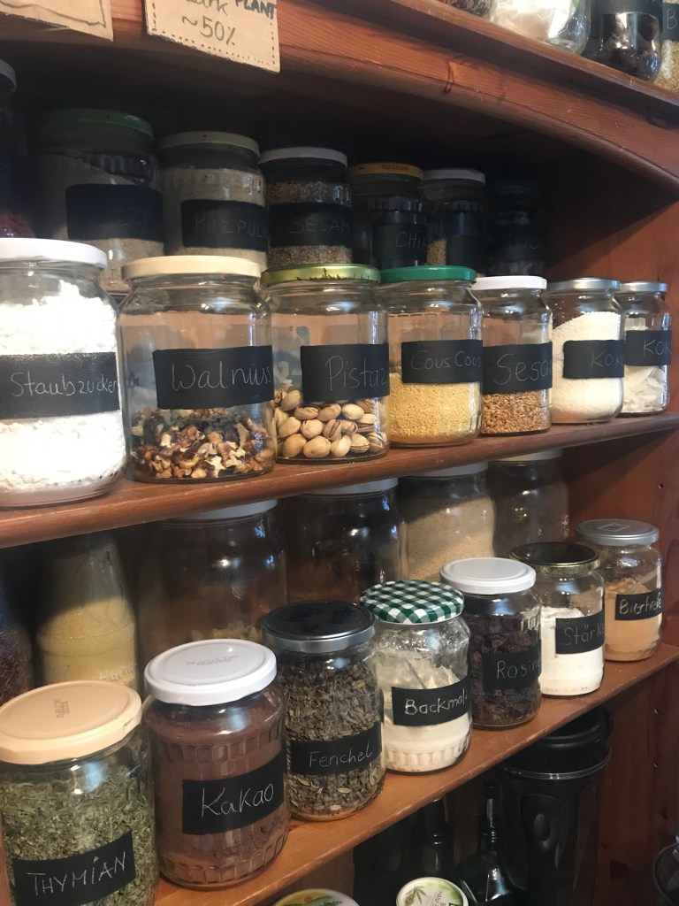 Doch im Dezember und Januar heißt es erst einmal ausruhen und Arbeiten im Haus erledigen. Zum Beispiel das Beschriften meiner vielen Vorratsgläser mit Tafelfarbe. Die verschiedenartigen Beschriftungen haben mir überhaupt nicht gefallen. Immer wieder habe ich überlegt was ich machen kann. Dann habe ich ein Doserl mit Tafelfarbe geschenkt bekommen. Zuerst mit Klebestreifen und dann mit einem Schwamm und Pinsel habe ich Felder drauf gepinselt und nach dem Trocknen mit einem weißen Stift beschriftet. Auf jeden Fall schaut es nicht schlecht aus . Wenn da nur nicht die vielen verschiedenen Deckel wären…