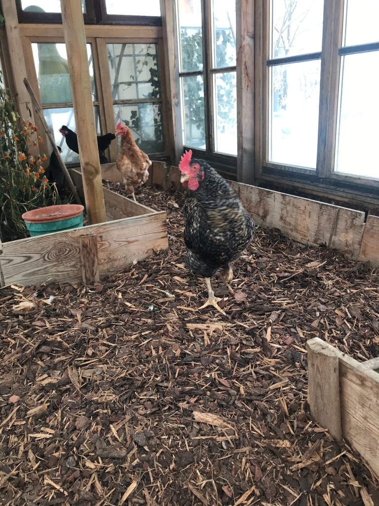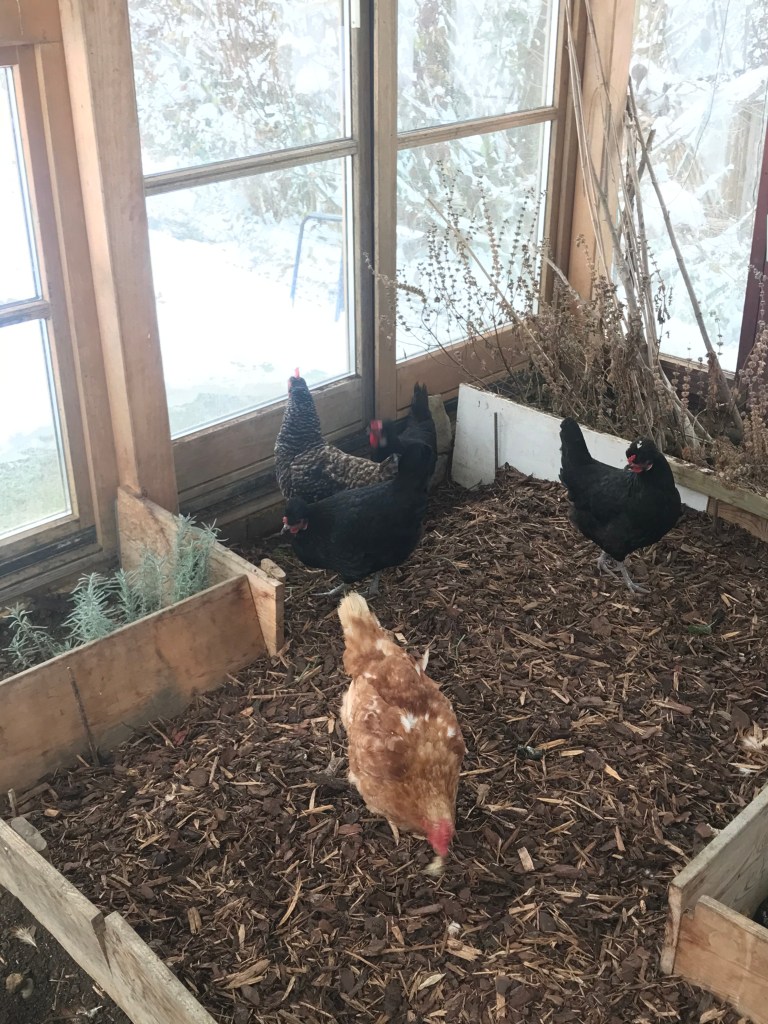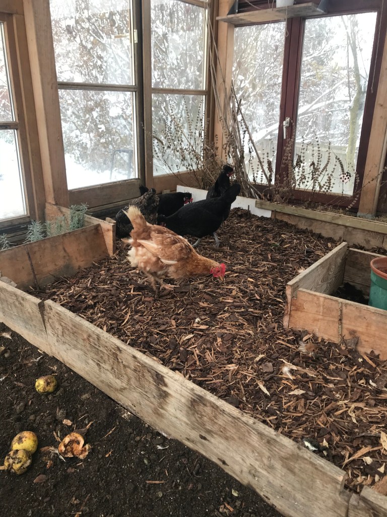 Unsere Hühner haben ihren Wintergarten bezogen und fühlen sich sehr wohl. Sie graben die Beete um, suchen Würmer, Käfer und anderes Kriechzeugs und bleiben trocken und geschützt. Die Artischokenpflanze die im Gewächshaus wächst haben wir abgedeckt um sie vor unseren Vögeln zu schützen. Und dem Marillenbaum im Eck sind die Hühner sicher egal. In den kalten und vor allen dunklen Wintermonaten legen unsere Hühner kaum Eier. Zum Eierlegen benötigen die Tiere mindestens 14 Stunden Licht. Da ich keine und mein Partner sehr wenige Eier isst, lassen wir das künstliche Licht weg. Das ist für die Tiere sicher das Natürlichste.