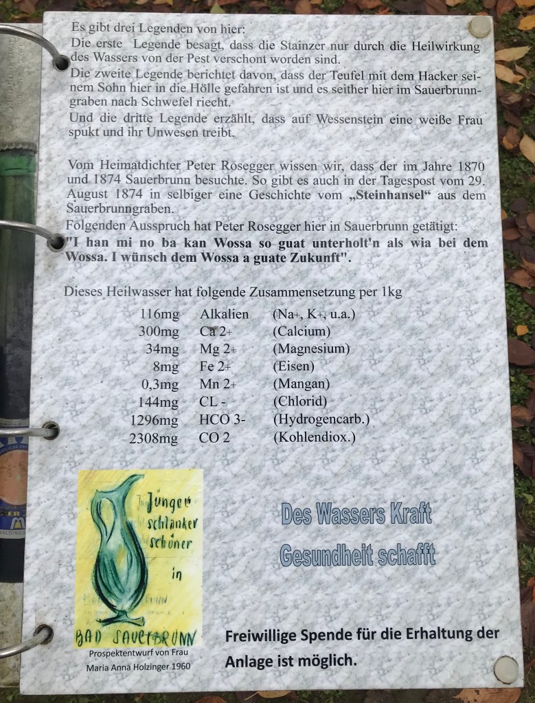 Die Umgebung der Quelle ist friedlich, schön und liegt am Ende eines kleinen Tales in der Nähe von Stainz. Alleine diese schöne Umgebung macht das wöchentliche Wasserholen zu einem Vergnügen.