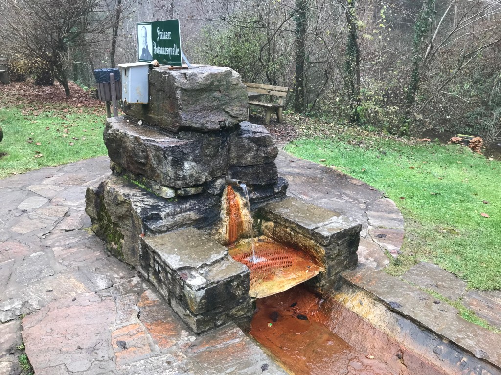 Das Wasser enthält viel Eisen, daher auch die Verfärbungen rund um den Wasserauslass und in dem angeschlossenen Becken, das zum bloßfüßigen Waten und Wassertreten einlädt. Sogar eine kleine, zweite Quelle die in den nahen Bach mündet ist von einem rötlichen Rand umgeben.