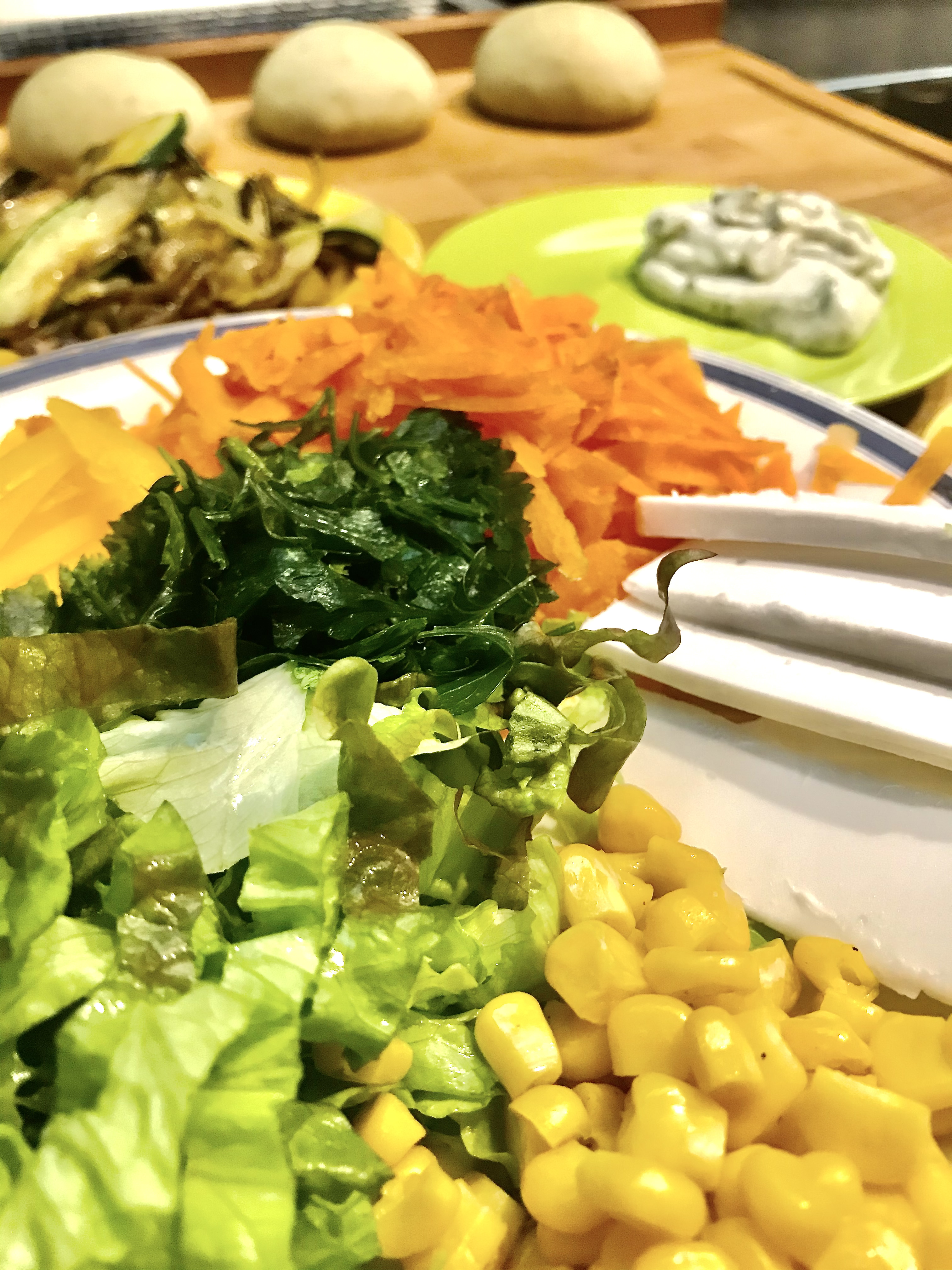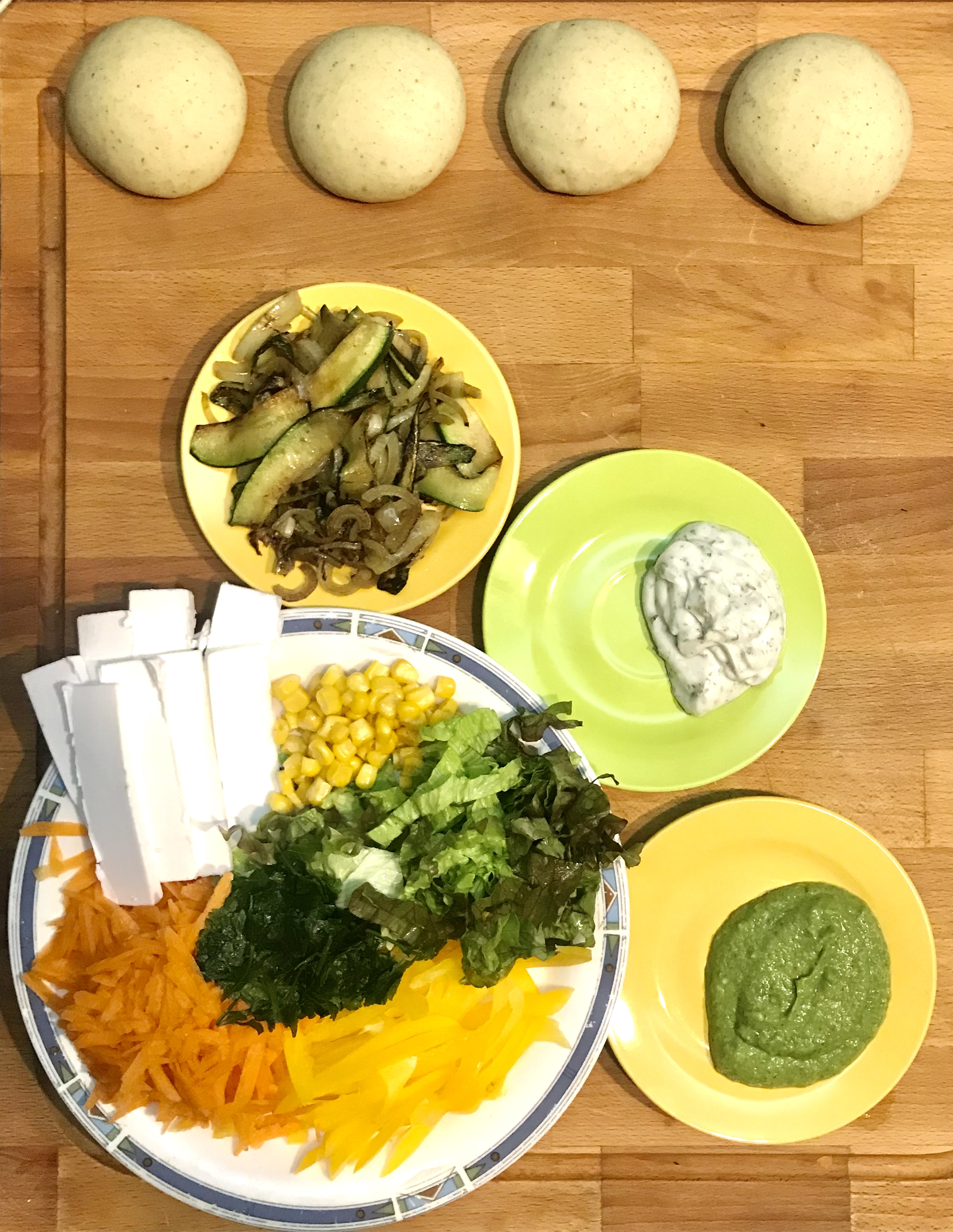 Da wir immer gerne ein warmes, würziges Kebab gegessen haben, fülle ich meine Brote mit Salat, geraspelten Karotten, geröstetem Gemüse, Paprika, Petersilie, Mais, einer Joghurtsauce und veganem und histaminarmen „Käse“ nach griechischer Art (z.B. Violife „Greek White“).