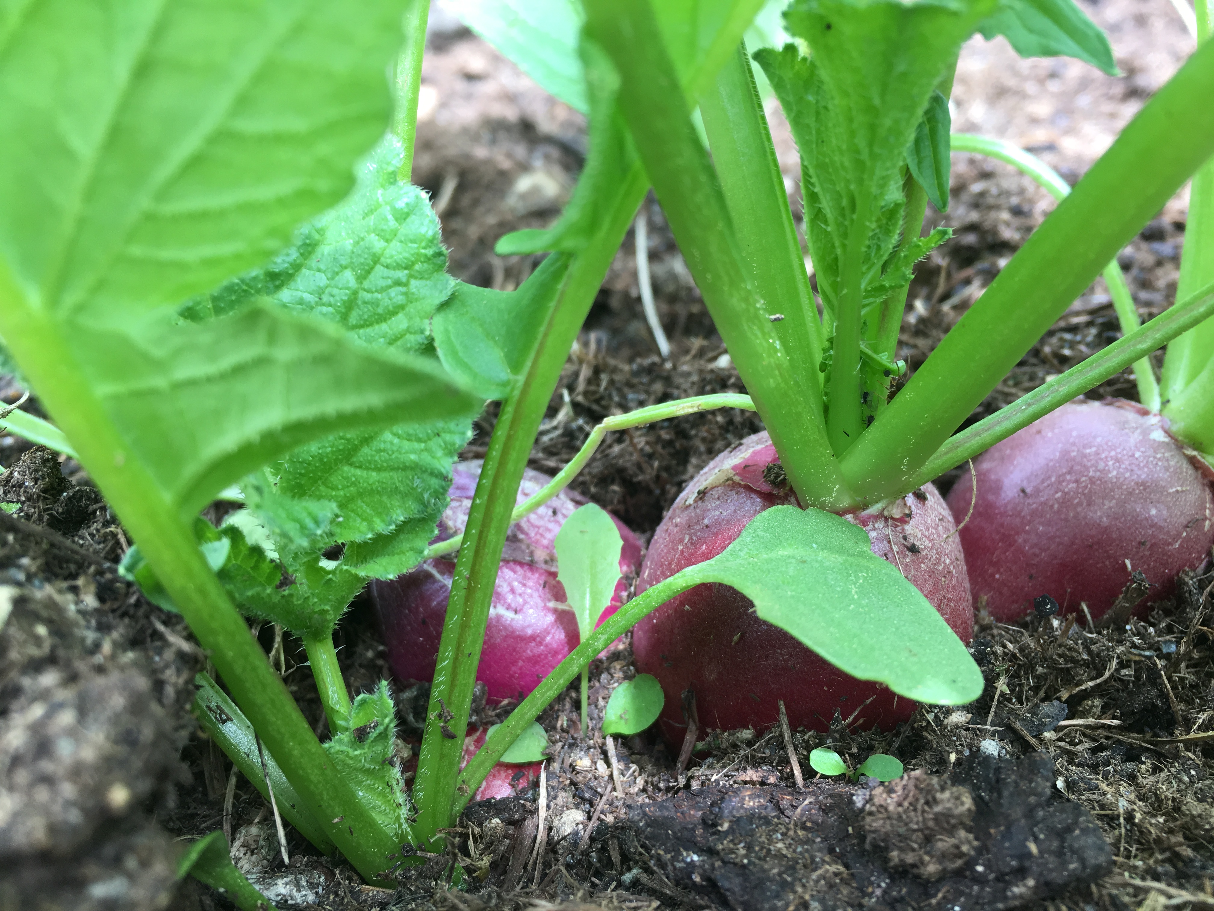 Radieschen habe ich in meinem Folientunnel bereits gesät, doch auch im Haus in Töpfen habe ich Radieschensamen mit der Methode „Multi sow“ ausgesät. Dazu nehme ich vier Samen und säe sie zusammen in ein Töpfchen. Wenn die Pflanzen dann groß genug sind, setze ich sie in die Erde. Dazu nehme ich den gesamten Erdballen mit den Pflänzchen aus dem Topf, grabe ein Loch und setze das Ganze hinein. Durch das Wachstum drücken sich die Radieschen auseinander und wachsen sehr gut. Dadurch spare ich Zeit und Mühe beim Aussäen und auch Platz im Beet. Die Radieschen scheinen gern mit ihren Freunden zusammen zu wachsen, denn sie gedeihen sehr gut. Beim Ernten dreht man das größte Radieschen vorsichtig heraus und die restlichen wachsen weiter.