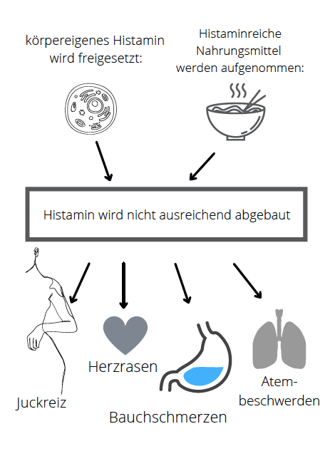Eine erworbene oder (seltener) angeborene Störung im Histaminabbau kann eine Histaminunverträglichkeit bzw. Histaminintoleranz auslösen. Durch die körpereigene Produktion von Histamin und/oder der Aufnahme von histaminreicher Nahrung befindet sich im Körper der betroffenen Person mehr Histamin als abgebaut werden kann.