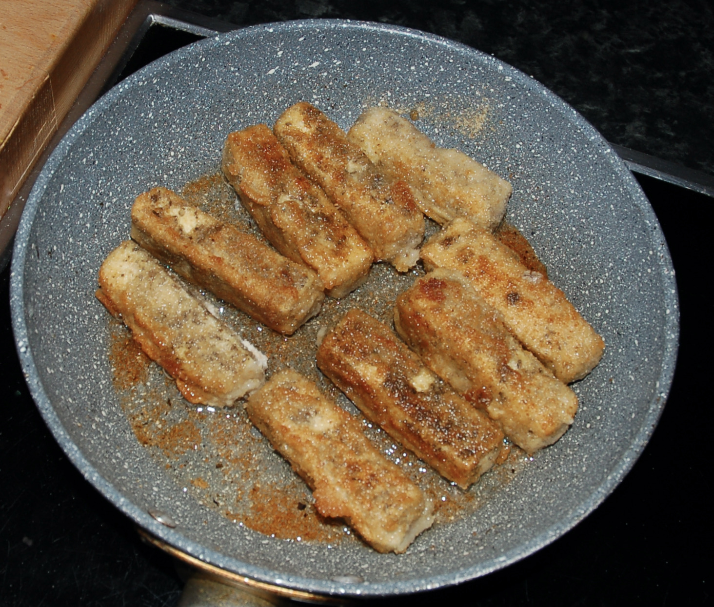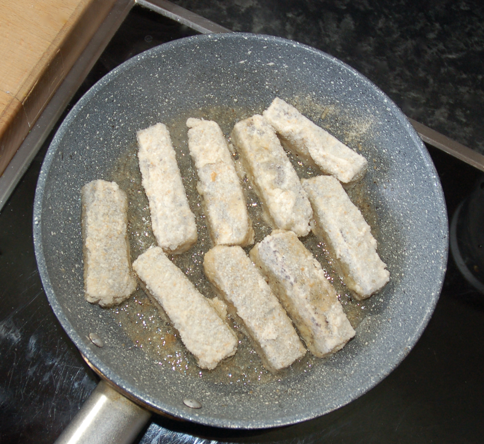 • Frittiere die Vischstäbchen in heißem Öl auf allen Seiten bis sie goldbraun sind.