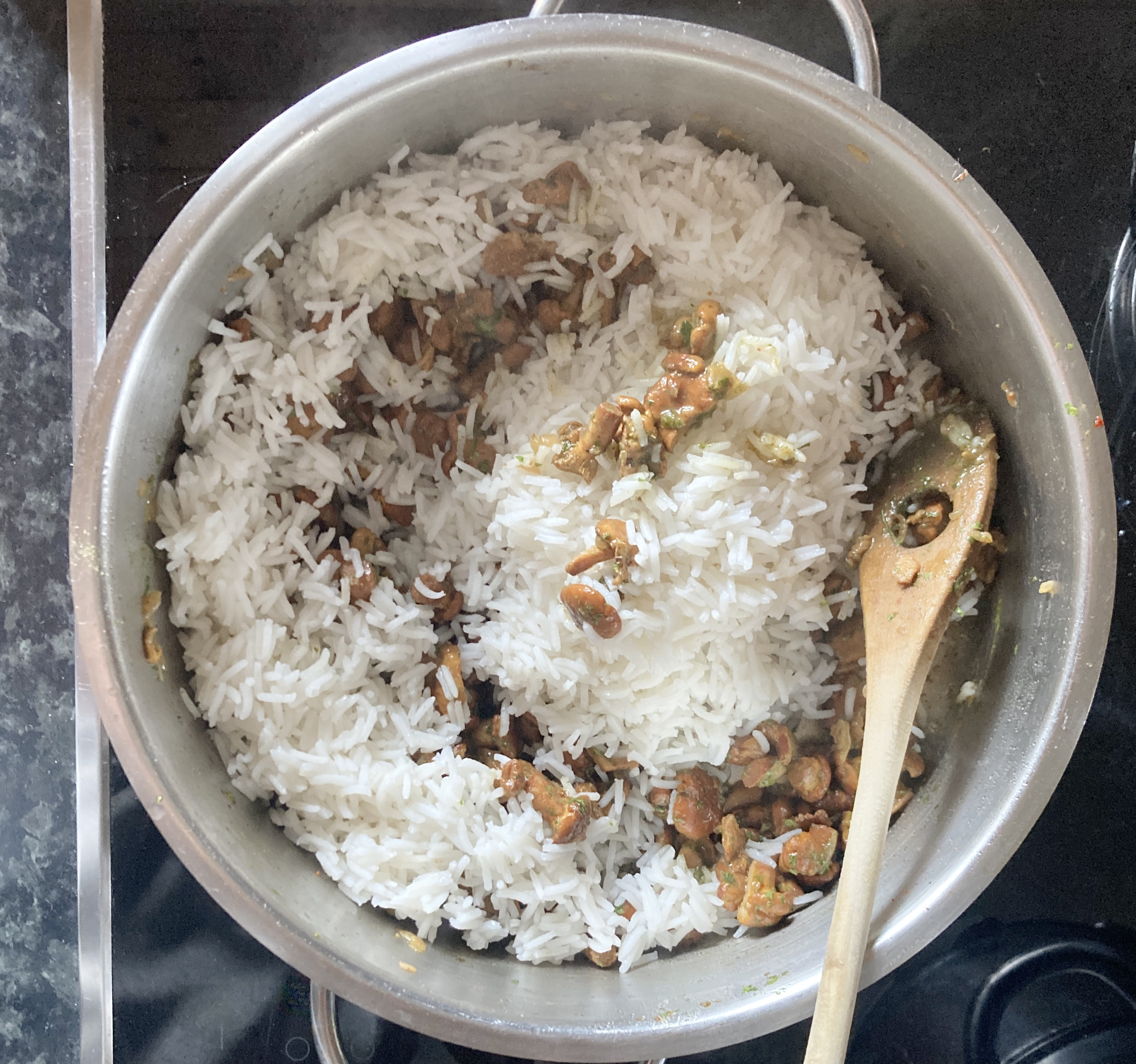Während der Reis kocht, bereite ich die Eierschwammerl zu. Zuerst schneide ich Zwiebeln würfelig und röste sie in etwas Rapsöl goldbraun an. Da Schwammerl oft mit Erde und Nadeln vermischt sind, entscheide ich mich, die Eierschwammerl zu waschen. Das ist bei den Pilzen normalerweise nicht empfehlenswert, da sie extrem viel Wasser aufsaugen, doch ist es meist die einzige Methode die vielen kleinen Schwammerl sauber zu bekommen. Gut abgetropft gebe ich die Eierschwammerl in meinen Topf mit den gerösteten Zwiebeln. Dort werden sie gegart, bis fast das ganze Wasser verdampft ist. Das kann eine Weile dauern, Schwammerl haben von Haus aus viel Wasser und wenn sie gewaschen sind umso mehr, doch gleichzeitig garen sie und sind dann bereit um mit dem Reis vermischt zu werden.
