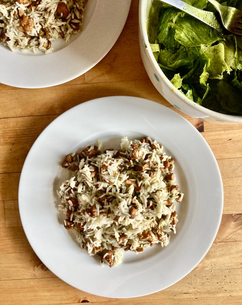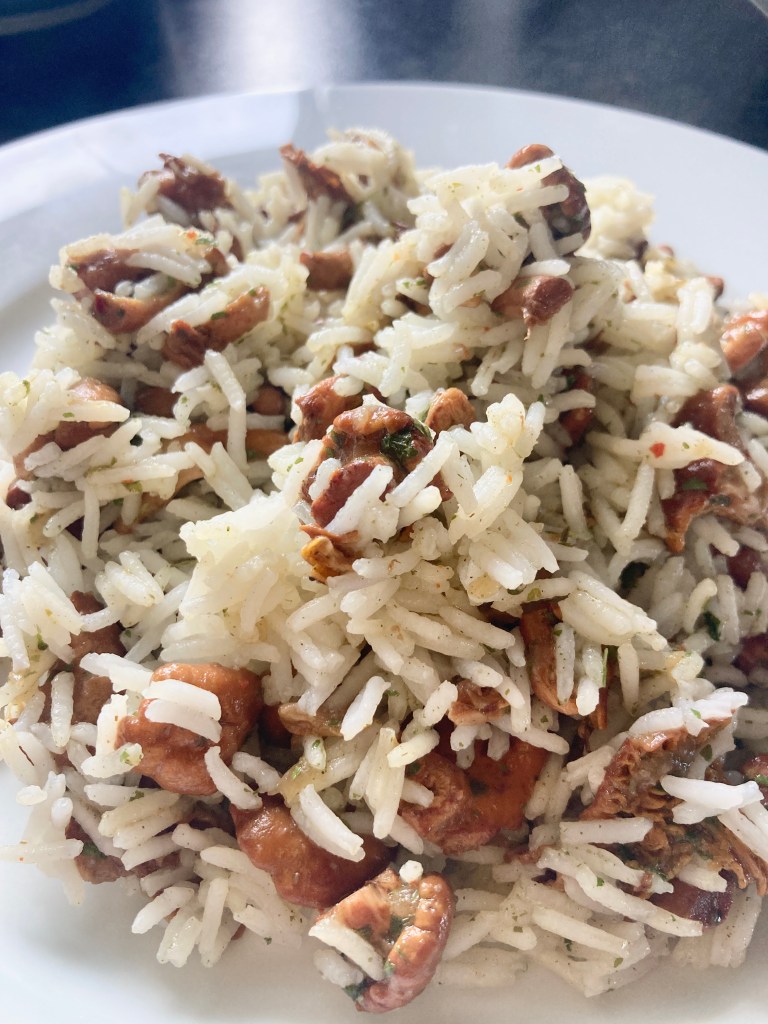 Kurz vor Ende der Garzeit würze ich mit Salz, Pfeffer, Petersilie, Liebstöckl und Paprika. Je nach Vorliebe kann auch ein wenig Chilipulver oder -flocken sowie Kurkuma hinzugefügt werden. Ich verfeinere dann die Eierschwammerl noch mit etwas Hafersahne. Nach dem Abschmecken vermenge ich die Eierschwammerl mit dem Reis, erhitze bei Bedarf das Ganze noch mal und serviere den Schwammerlreis mit einem grünen Salat.