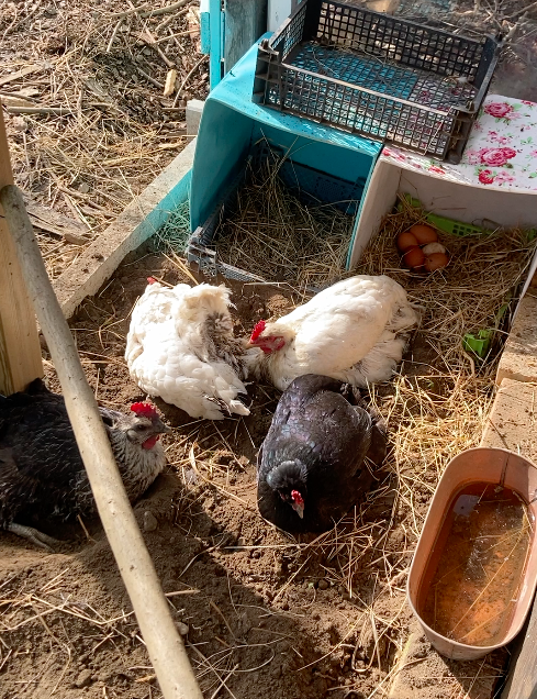 Den Boden habe ich anfangs mit unserem eigenen Heu bedeckt, nur um dann drauf zu kommen, dass Sand besser wäre. Hühner brauchen trockenen Sand oder Erde für die Gefiederpflege. Also – Heu raus – Sand rein. Als Nistboxen habe ich zwei Aufbewahrungsboxen aus Stoff und zwei Plastikkörbe benutzt. Die Plastikkörbe sind Einmalkörbe aus dem Supermarkt, die sonst weggeworfen werden. Da rein kam eine Schicht Heu und die Hühner nehmen es sehr gerne an.