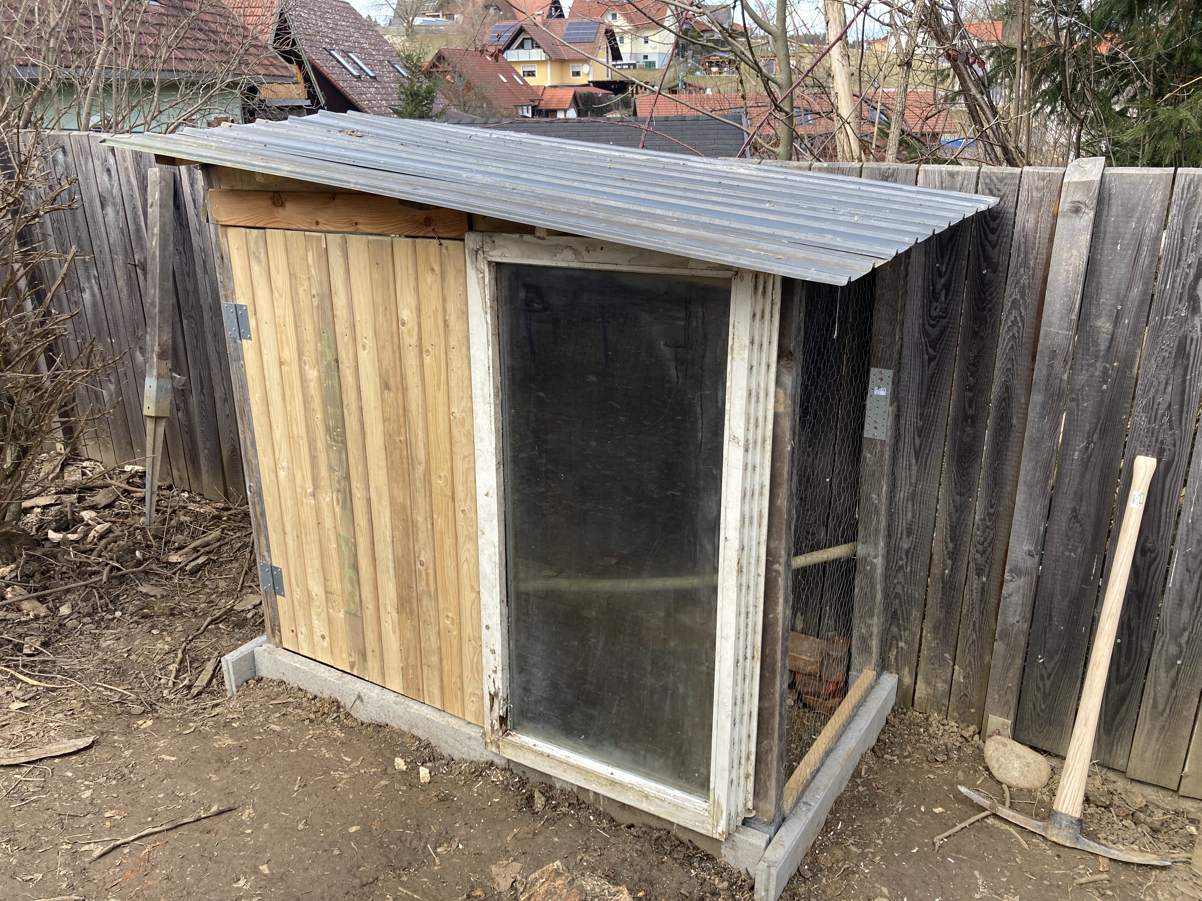 Der Bau des kleinen Stalles ging wirklich schnell, wir haben Betonrandsteine als Fundament verwendet um Tieren das Untergraben zu verleiden. Dann noch Steher als Eckpfosten, alte Fenster und Hasendraht (bessere Lüftung) für die Seiten. Eine stabile Türe wurde vorne montiert und fertig war die Basis. Für das Dach haben wir Latten montiert und ein Dachelement aus Blech verwendet.