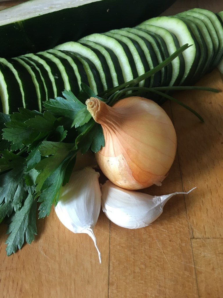 Nun zu den Zutaten die auf unseren Pizzen landeten: selbstgemachte Paprikasoße, gut gewürzt, Zucchini und Zwiebel dünn geschnitten, Knoblauch, in Öl gepresst Paprikastreiferl, Mais, Eierschwammerln (selbstgesucht, tiefgekühlt und aufgetaut) und veganer Käse.