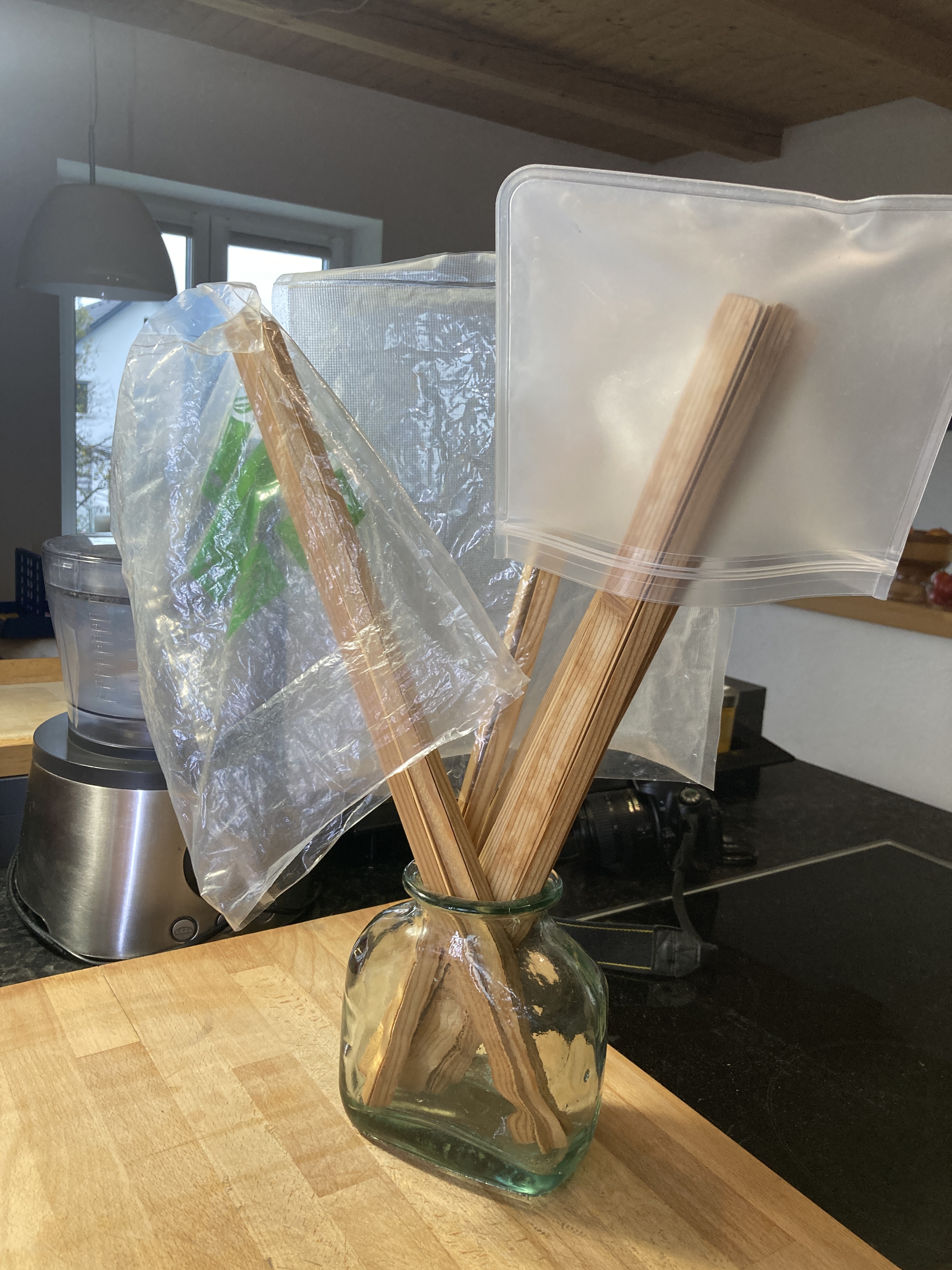 Ich verwende Plastiksackerl so oft wie möglich. Denn ganz ohne geht es auch in meinem Haushalt nicht. Manchmal braucht man dieses Dinger einfach und oft kommen sie auch von draußen ins Haus. Wenn meine Mutter etwas mitbringt, freue ich mich und verwende auch dieses Plastiksackerl wieder. Nur wenn sie ganz grauslich oder löchrig sind, dann kommen sie in den gelben Sack. Natürlich kommen bei mir wiederverwendbare Verpackungen als erstes zum Einsatz. Ich friere fast alles in Glas oder Plastikboxen ein, ich verwende Teller oder Bienenwachstücher zum Abdecken von Schüsseln. Und doch, die Plastiksackerl gibt es, sie werden einfach nur so oft wie nur möglich verwendet. Damit sie beim nächsten Mal sauber sind, wasche ich sie mit Geschirrspülmittel innen und außen ab und hänge sie nach dem Abspülen auf mein DIY-Gestell zum Trocknen. Danach landen sie in einer Schublade und warten auf ihre Wiederverwendung.