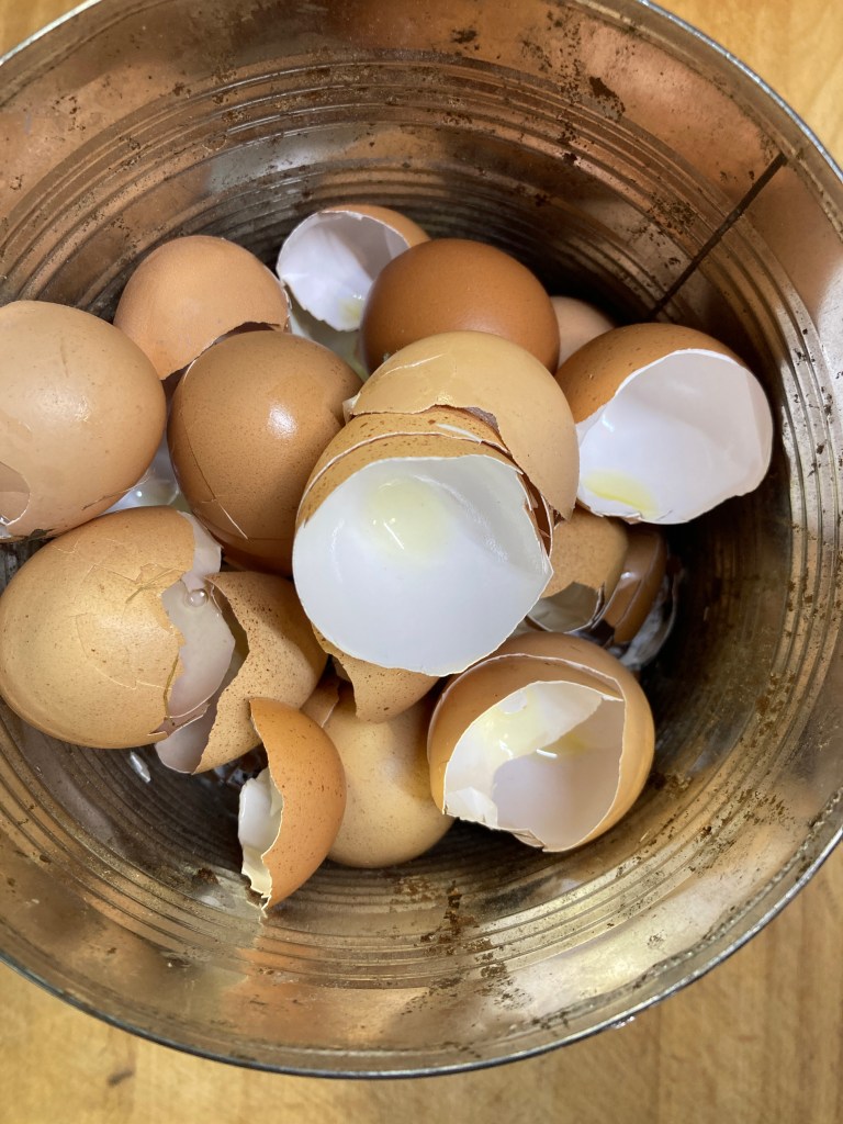 Eierschalen sind eine wertvolle Ressource bei uns. Meine Hühner brauchen immer eine Kalk-Quelle, um gesund zu bleiben und kräftige Eierschalen zu produzieren, daher sammle ich alle Eierschalen und habe auch in meiner Familie gebeten, Eierschalen zu sammeln. Das funktioniert super und ich bekomme von Zeit zu Zeit eine Lieferung entweder im Eierkarton oder bereits zerkleinert.