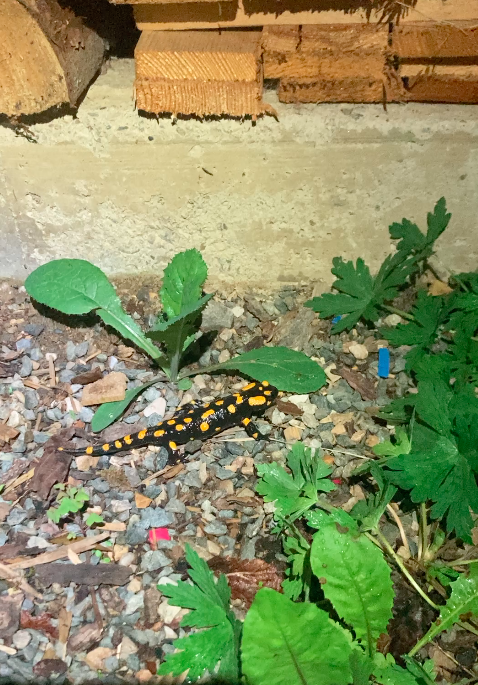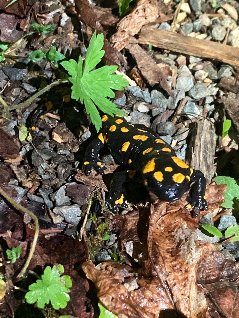 Doch am interessantesten war meine letzte Begegnung, als wir in unserem Keller ein Jungtier fanden. Ich habe den kleinen Salamander gleich über die Straße in den feuchten Graben gebracht. Gut war, dass ich von der Gartenarbeit noch meine Handschuhe trug, denn das Hautsekret eines Feuersalamanders kann im besten Fall doch ein recht unangenehmes Brennen verursachen. Als ich am Abend dann meinen abendlichen Rundgang machte, wer saß da an der Gartentüre? Der kleine Feuersalamander.