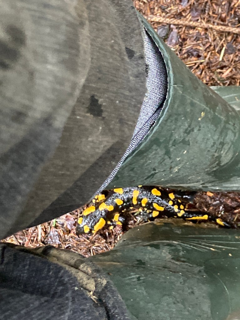 Am nächsten Tag erkundigte ich mich bei www.naturschutzbund.at was am besten zu tun sei. Der Ratschlag war, den kleinen Feuersalamander in Ruhe zu lassen und den recht außergewöhnlichen Fund in der App des Naturschutzbundes zu verzeichnen. Diese App gibt User:innen die Möglichkeit Entdeckungen mit Fundort zu melden, um eine Art Bibliothek von Funden zu schaffen.