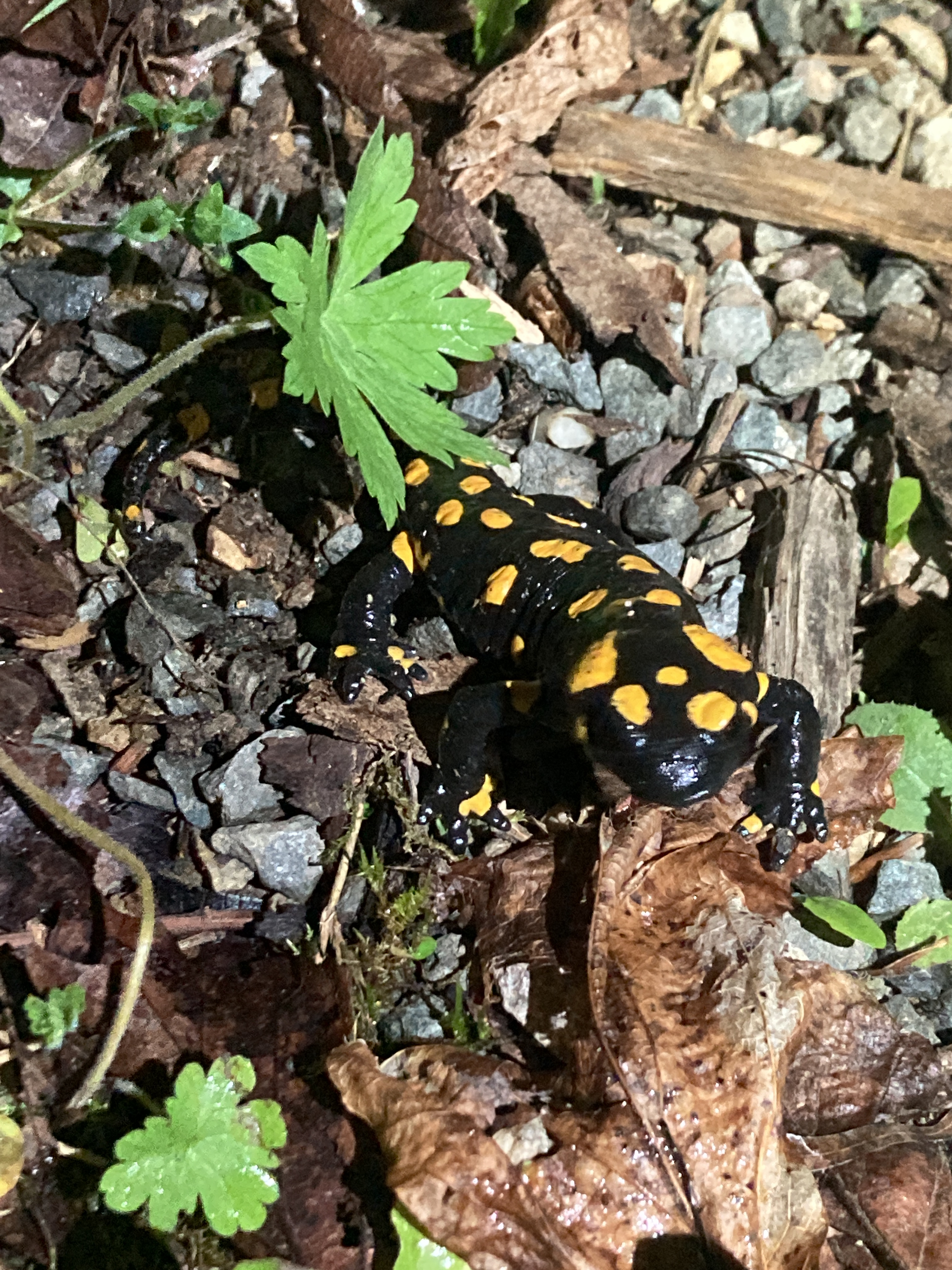 Doch am interessantesten war meine letzte Begegnung, als wir in unserem Keller ein Jungtier fanden. Ich habe den kleinen Salamander gleich über die Straße in den feuchten Graben gebracht. Gut war, dass ich von der Gartenarbeit noch meine Handschuhe trug, denn das Hautsekret eines Feuersalamanders kann im besten Fall doch ein recht unangenehmes Brennen verursachen. Als ich am Abend dann meinen abendlichen Rundgang machte, wer saß da an der Gartentüre? Der kleine Feuersalamander.
