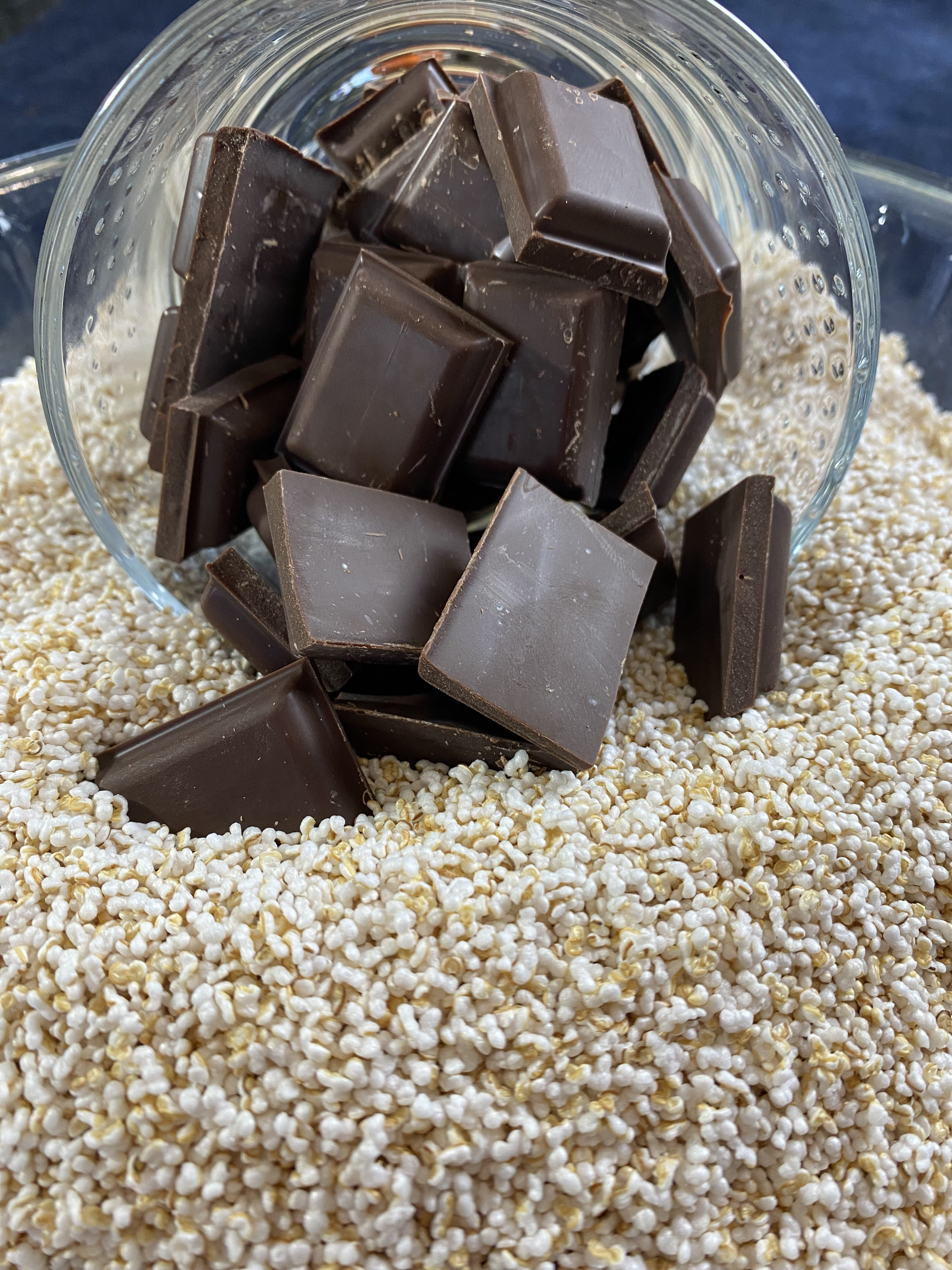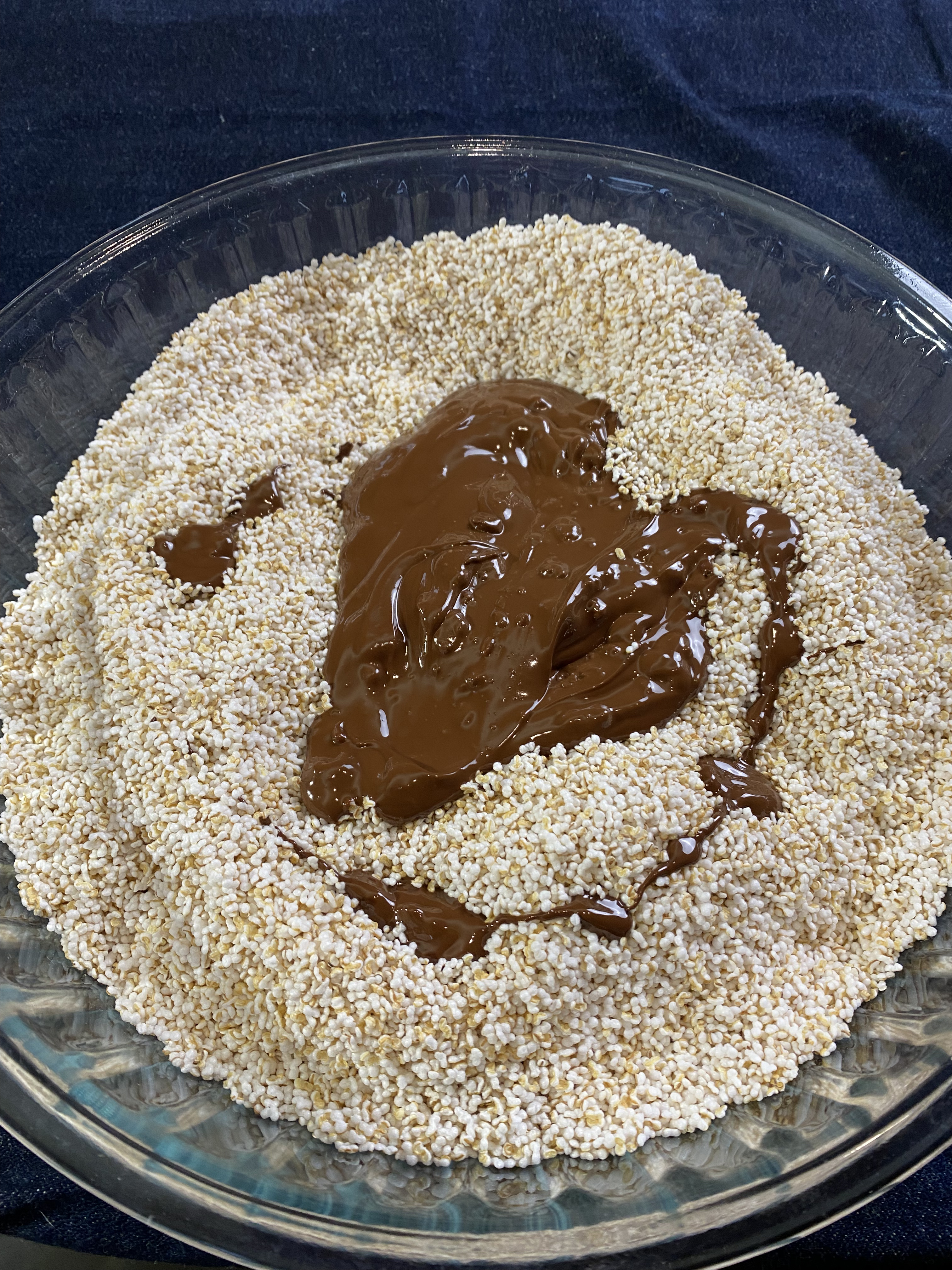 - Amarant untermischen: Rührt den gepufften Amarant in die Schokolade ein, bis alle Körner gut von der Schokolade umhüllt sind.
