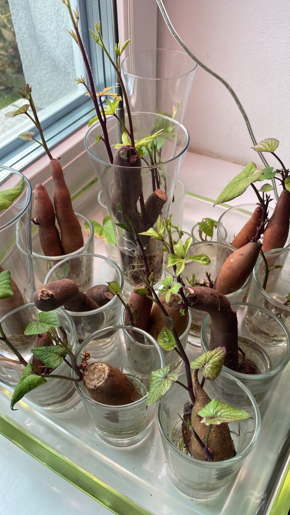 Lange Zeit lag meine Spiegelreflexkamera unbenutzt in ihrer Tasche. Heute packte mich wieder einmal die Lust zu fotografieren. Also holte ich die Kamera, setzte mich ans Fenster und wollte ein paar Fotos von den Süßkartoffeln machen. Die habe ich zum „Steckling ziehen“ auf der Fensterbank in Wasser angesetzt.
