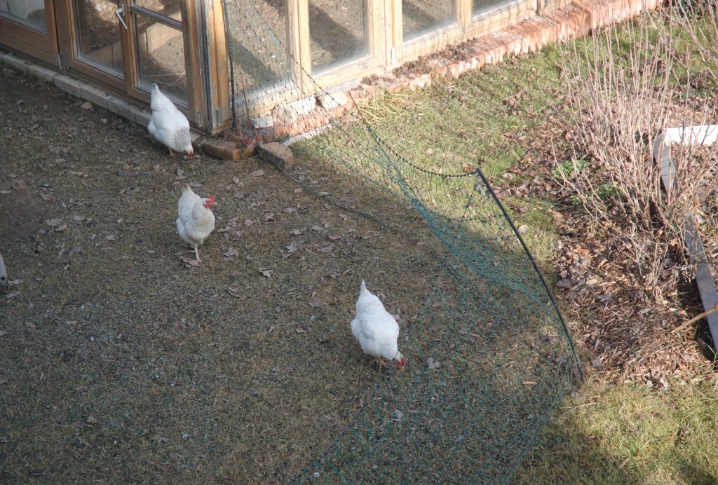 Während ich die Kamera hielt und die verschiedensten Winkel ausprobierte, fiel mir plötzlich ein weißer Fleck im Garten auf. Seltsam. Schnee hatten wir keinen, und weiße Container oder andere Gartenutensilien lagen dort auch nicht herum. Ich schaute durch die Kamera, zoomte heran – bis sich der weiße Fleck bewegte. Natürlich! Eine unserer weißen Hennen hatte es wieder einmal geschafft, über den mobilen Zaun zu flattern. Ganz unbeeindruckt spazierte sie durch den Garten, immer auf der Suche nach einem Wurm, einem Happen zum Fressen oder einem besonders einladenden Fleck Erde zum Scharren.