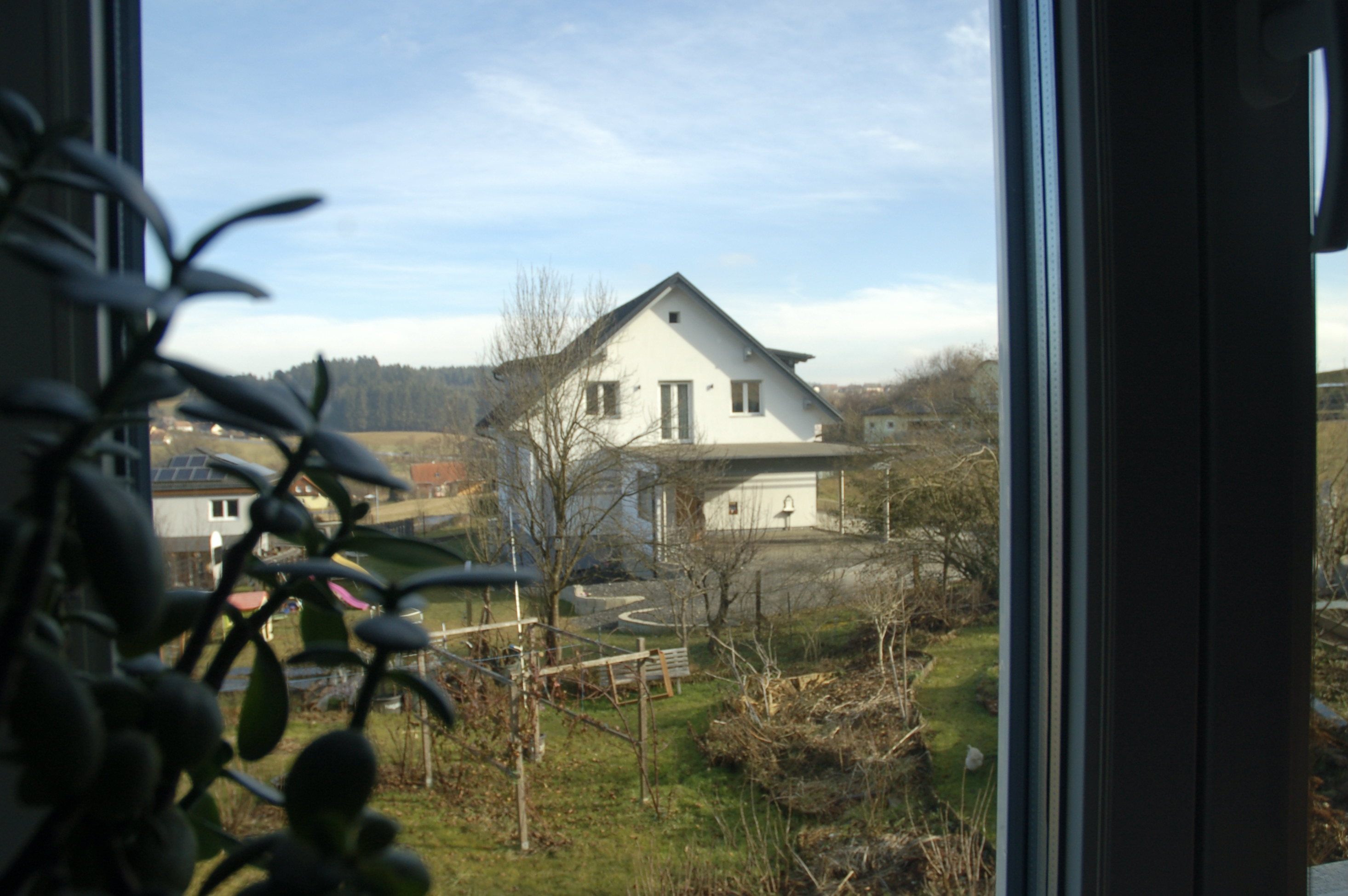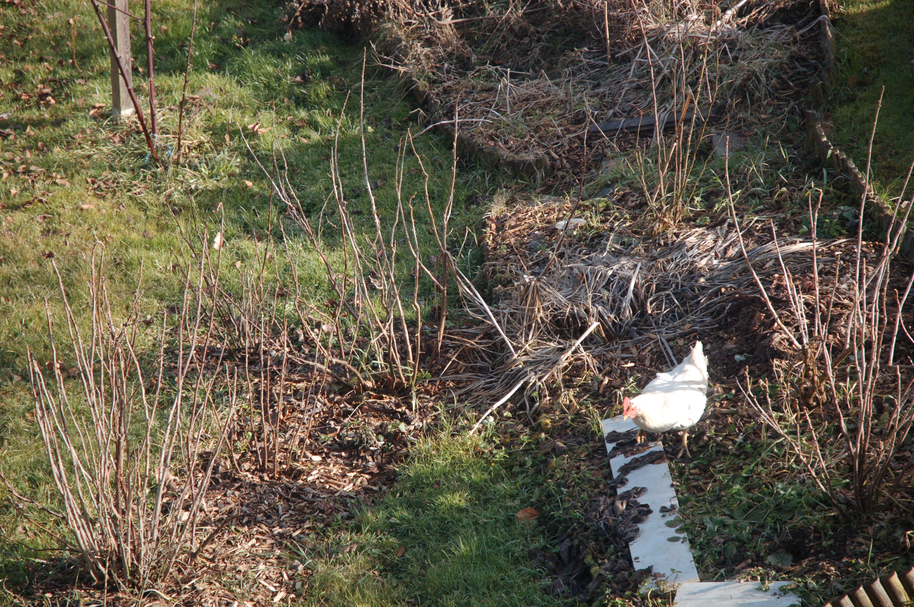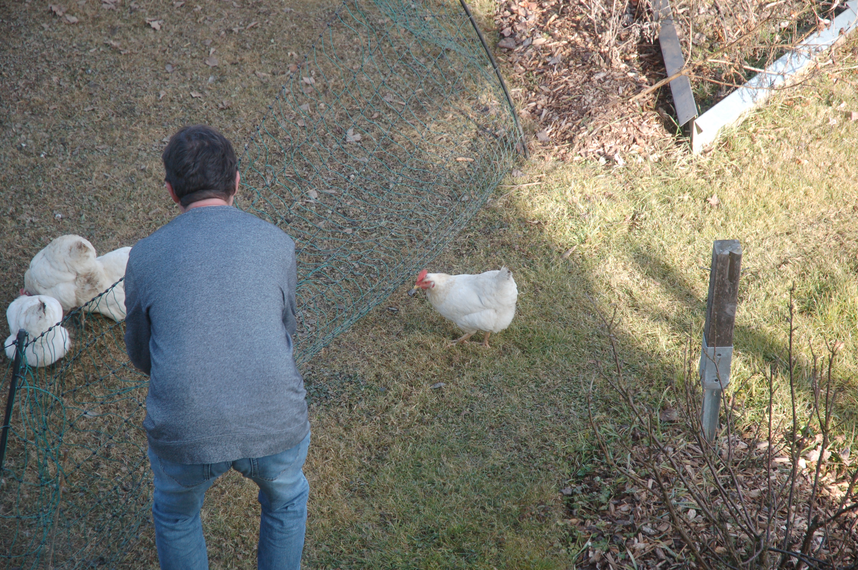 Während ich die Kamera hielt und die verschiedensten Winkel ausprobierte, fiel mir plötzlich ein weißer Fleck im Garten auf. Seltsam. Schnee hatten wir keinen, und weiße Container oder andere Gartenutensilien lagen dort auch nicht herum. Ich schaute durch die Kamera, zoomte heran – bis sich der weiße Fleck bewegte. Natürlich! Eine unserer weißen Hennen hatte es wieder einmal geschafft, über den mobilen Zaun zu flattern. Ganz unbeeindruckt spazierte sie durch den Garten, immer auf der Suche nach einem Wurm, einem Happen zum Fressen oder einem besonders einladenden Fleck Erde zum Scharren.