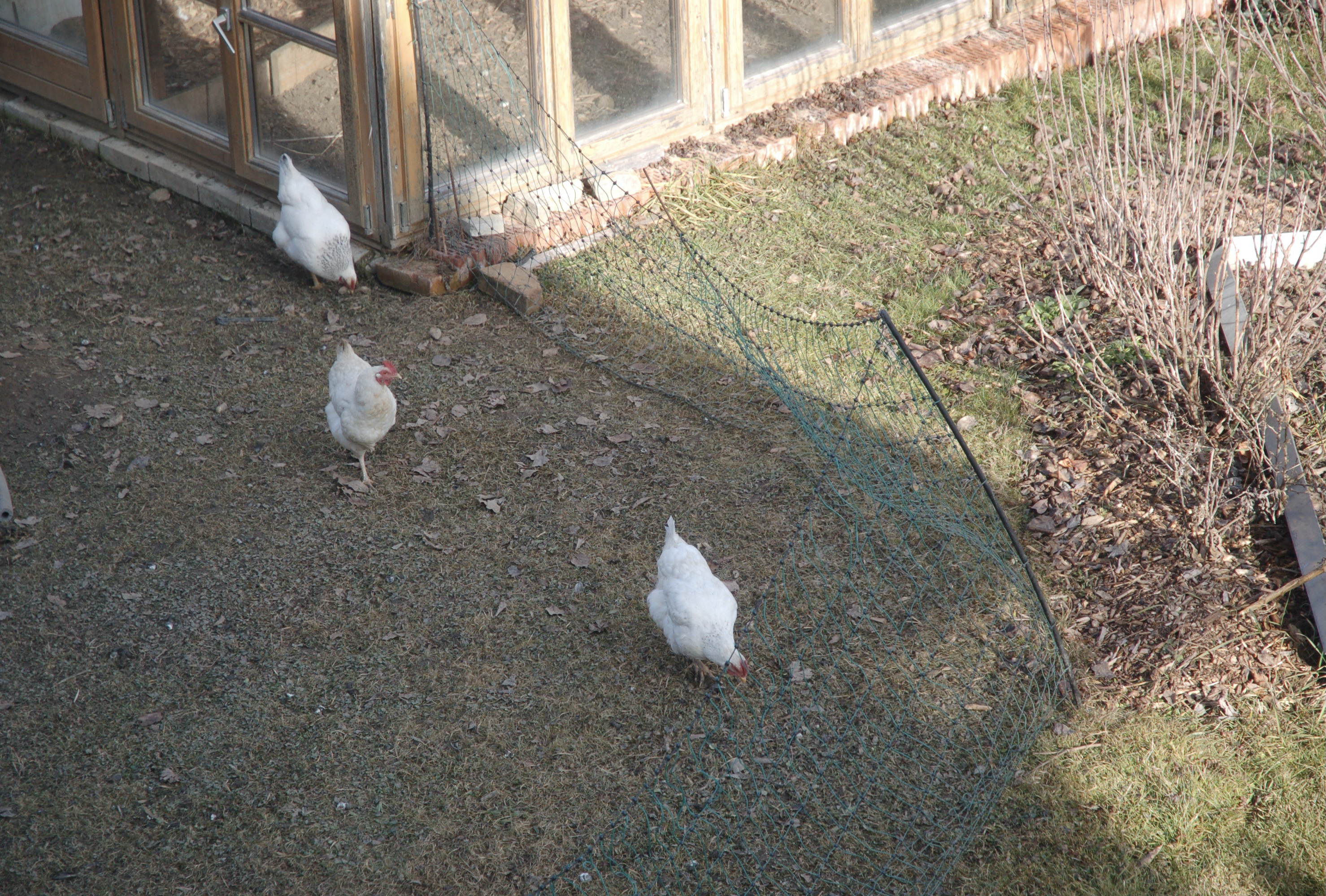 Es war lustig zu bobachten: Wie ein kleiner Mini-Dinosaurier rannte sie so schnell sie konnte Richtung Zaun, die Beine trappelten, die Flügel ein wenig ausgestreckt, bereit sofort wieder heimzukommen. Mein Mann hob den Zaun ein Stück an, und schwupps, schlüpfte sie wieder zurück zu den anderen Hennen. Dort wurde sofort mit dem Rest des weißen Teams fleißig gepeckt und gepickt.