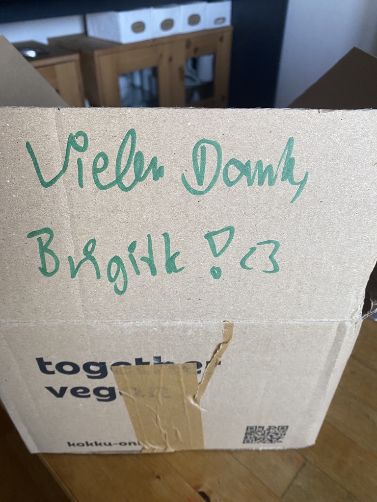 Bestellt haben wir bei der Firma www.kokku-online.de, einer Seite die sich von Lebensmitteln über Tierfutter bis hin zu Kosmetik- und Hygieneartikel auf vegane Produkte spezialisiert hat. Ich mache hier unbezahlte Werbung, da mir die Seite einfach gefallen hat. Das Bestellen, die schnelle, gekühlte Lieferung und das ganze Drumherum waren ausgezeichnet. Ein kleines Highlight: die nette Botschaft auf dem Lieferkarton. Preiswertes Einkaufen war es nicht, aber so eine Bestellung tätigt man auch nicht jeden Tag, es ist ab und zu einfach mal was Besonderes. Wenn ihr Lust habt, checkt die Webseite und schaut ob das was für euch sein könnte.