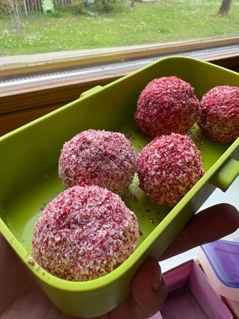 Meine Tochter gibt sich von Anfang an viel Mühe, ihm möglichst viele verschiedene Lebensmittel anzubieten. Sie probiert ständig neue Rezepte aus – und dieses Mal war ich mit ihr zusammen in der Küche. Wir haben ein Rezept von Maeva Da Silva ausprobiert: Erdbeer-Kokosbällchen. Super einfach, gesund und richtig fein – nicht nur für Kinder!