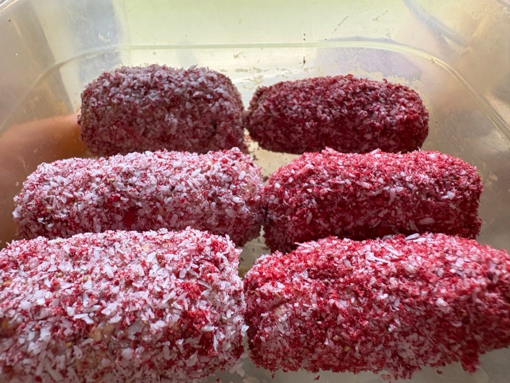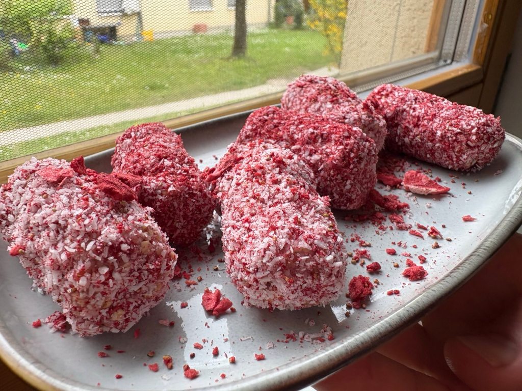 Alles kommt zusammen in den Mixer und wird zu einer festen, leicht klebrigen Masse verarbeitet. Daraus formt man kleine Kugeln – oder Stangen, wenn sie für kleine Hände besser greifbar sein sollen. Dann einfach in den Kokosraspeln wälzen – fertig ist der gesunde Snack! Wir hatten noch den Rest einer Packung getrockneter Erdbeeren zum Wälzen und die Mischung sieht einfach umwerfend und einladend aus.