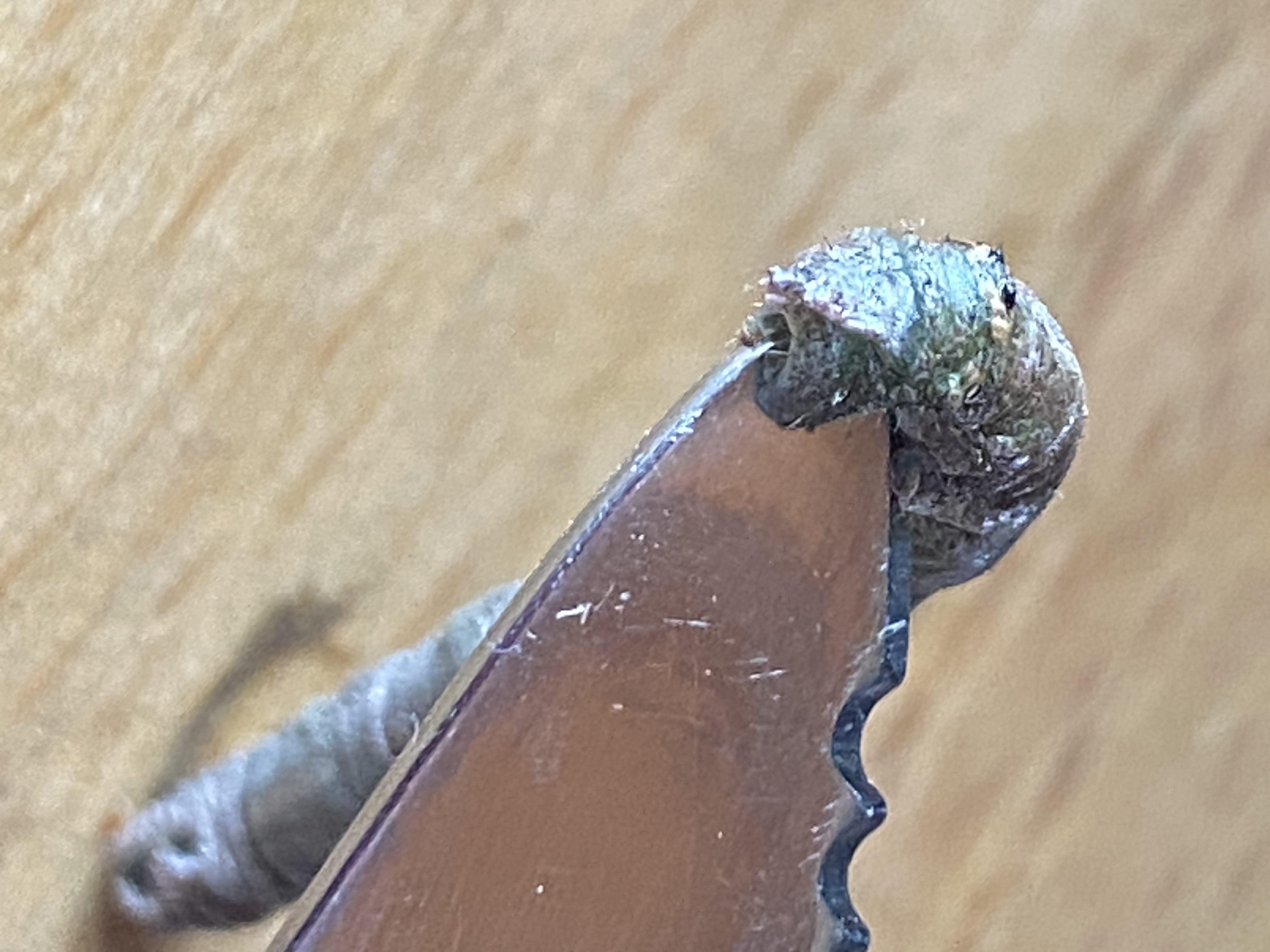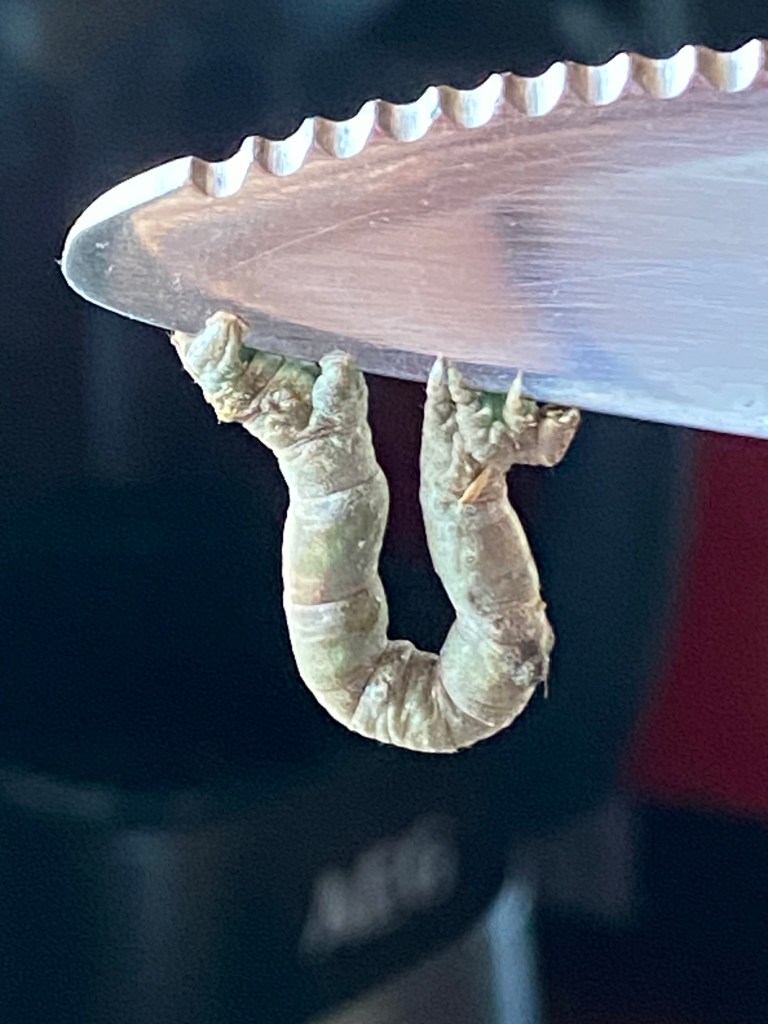 Zur Tarnung streckt sich die Raupe regungslos – so wirkt sie wie ein trockener Ast. Als ich sie näher fotografieren wollte und sie vorsichtig mit dem Messer zur Seite schieben wollte, wurde endgültig klar: das ist ein Lebewesen. Sie klammerte sich mit winzigen Füßchen ans Messer – ob das nun die Vorder- oder Hinterbeine waren, weiß ich nicht genau. Jedenfalls: ein beeindruckender Überlebensinstinkt.