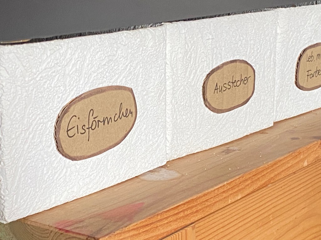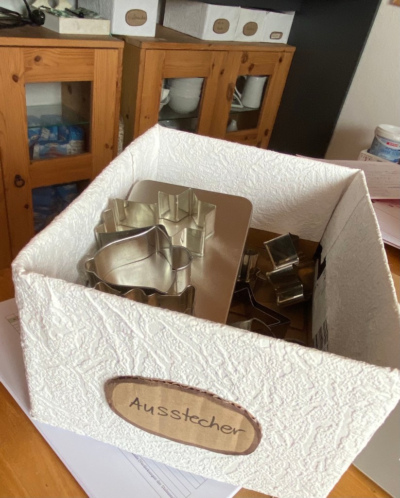 Zum Schluss kommt ein beschriftetes Schild aus Karton drauf – fertig ist die kostenlose, individuelle Aufbewahrungsbox für alles, was sich im Alltag so ansammelt. Noch schöner wird’s, wenn mehrere Schachteln die gleiche Größe haben – dann sieht das Regal gleich viel aufgeräumter aus.