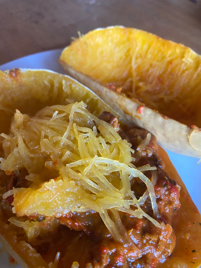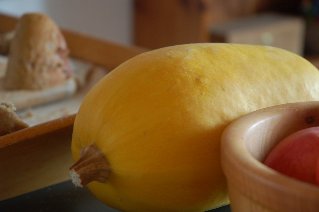 Vor ein paar Tagen – gerade noch rechtzeitig vor dem Frost – haben wir sechs wunderschöne Spaghettikürbisse geerntet.