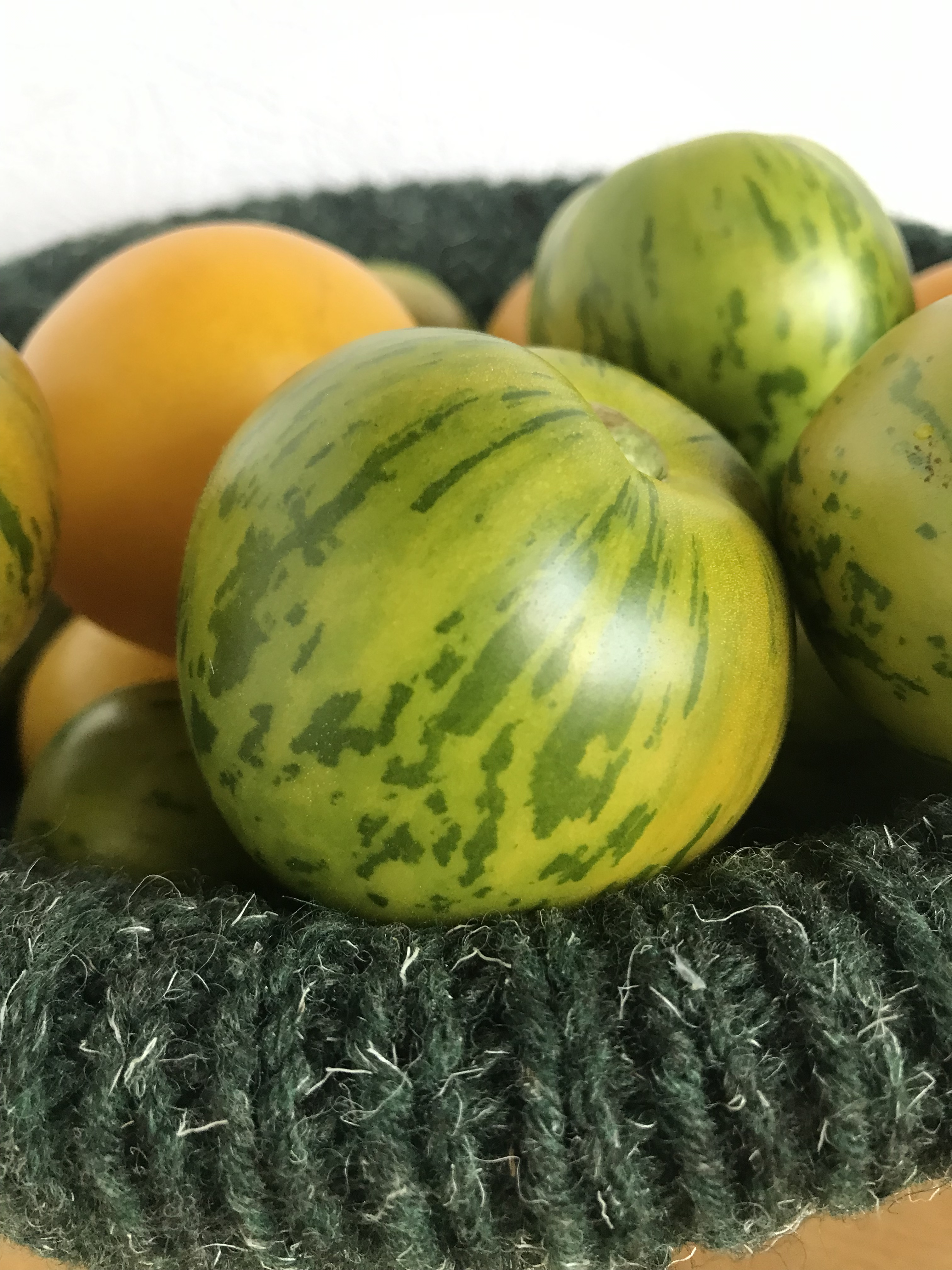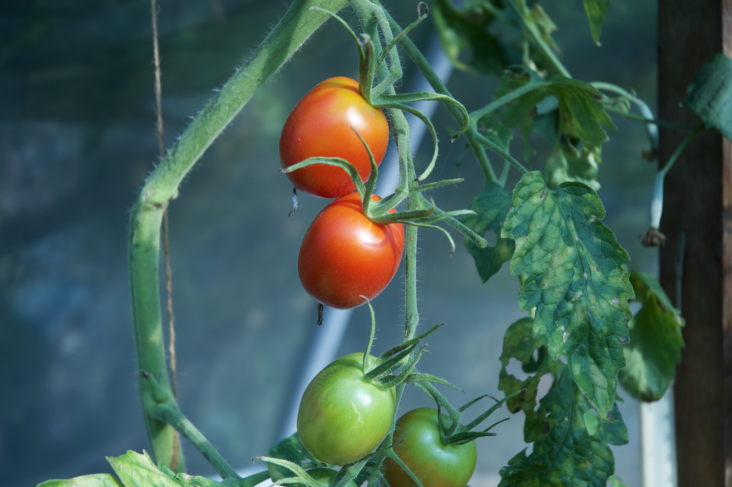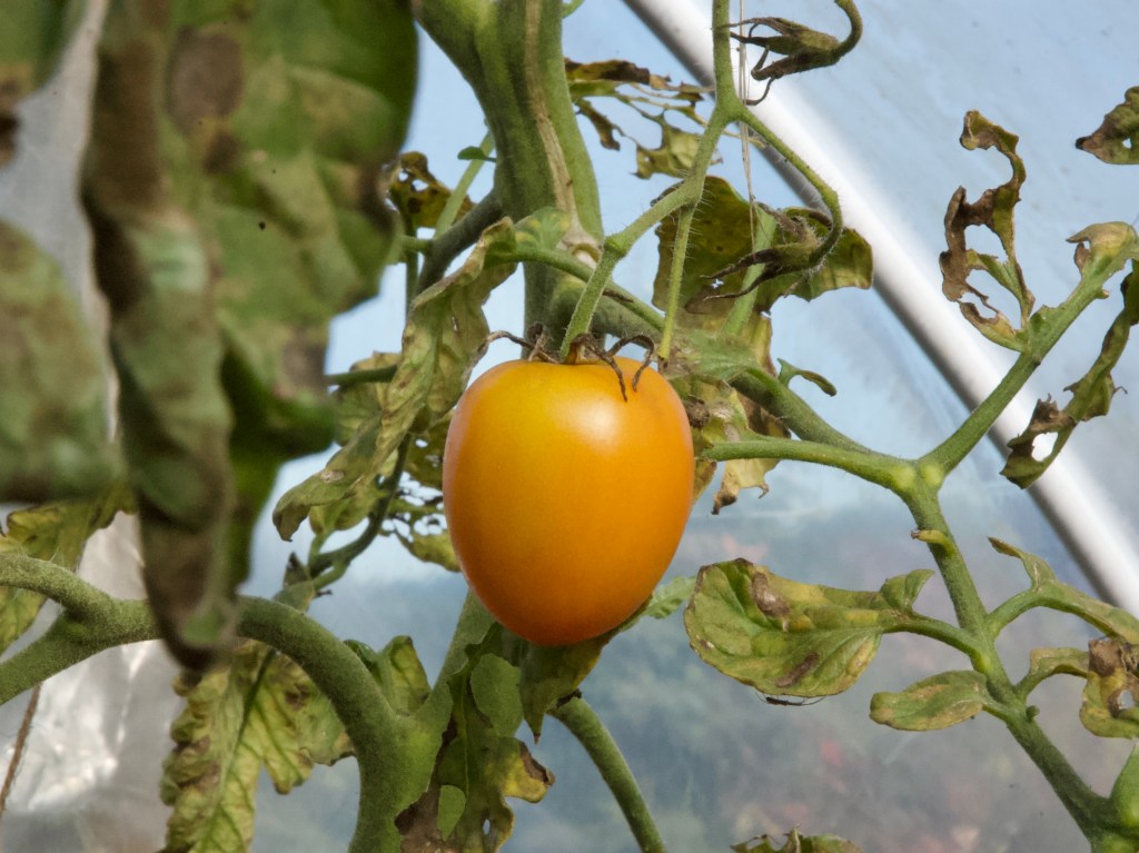 Zwar geht die Gartensaison langsam zu Ende, doch im Gewächshaus hängen noch ein paar grüne Früchte, die ich nicht übers Herz gebracht habe, abzuschneiden. Zwei Pflanzen habe ich einfach stehen lassen – vielleicht reifen sie ja doch noch nach.