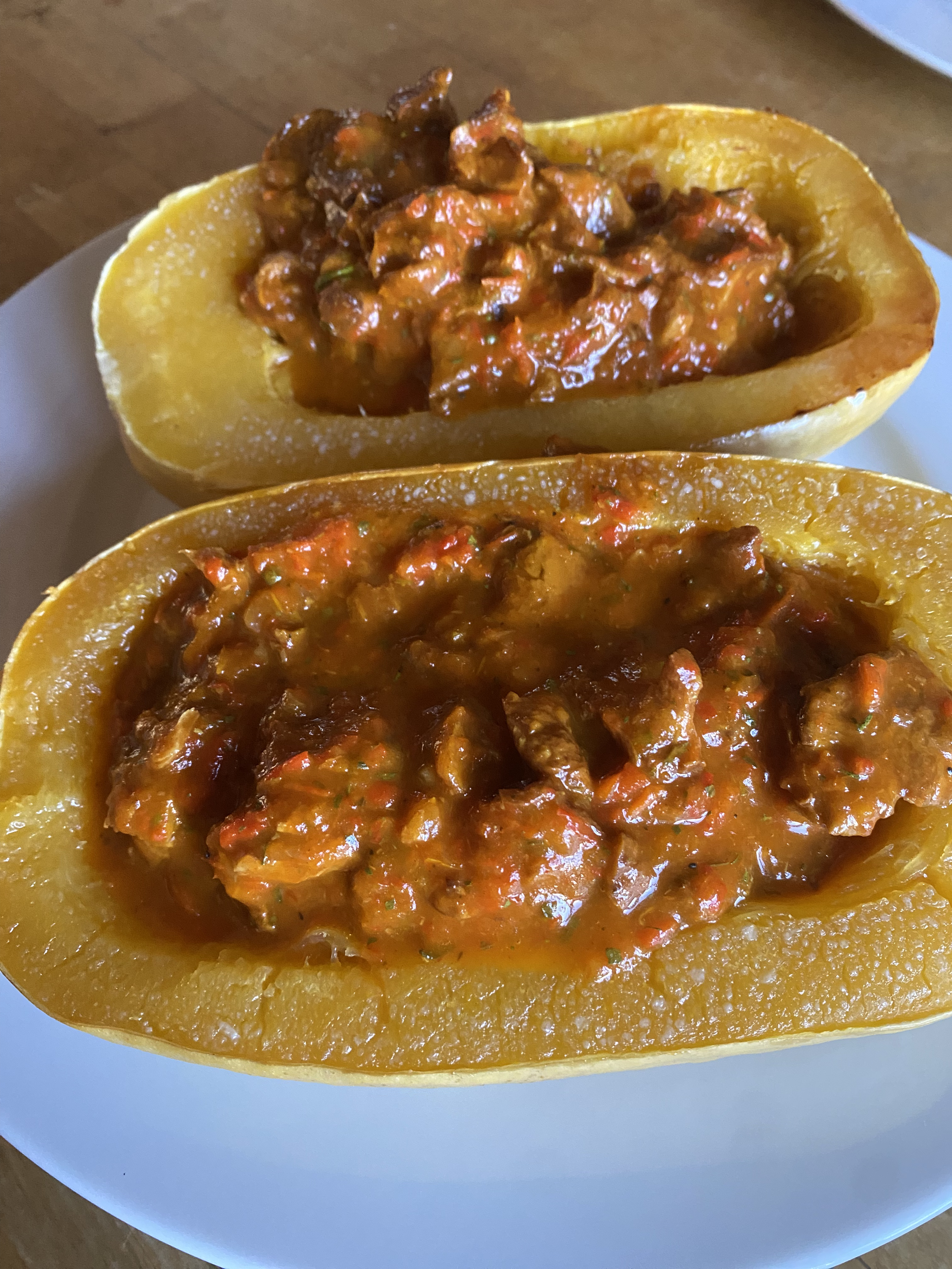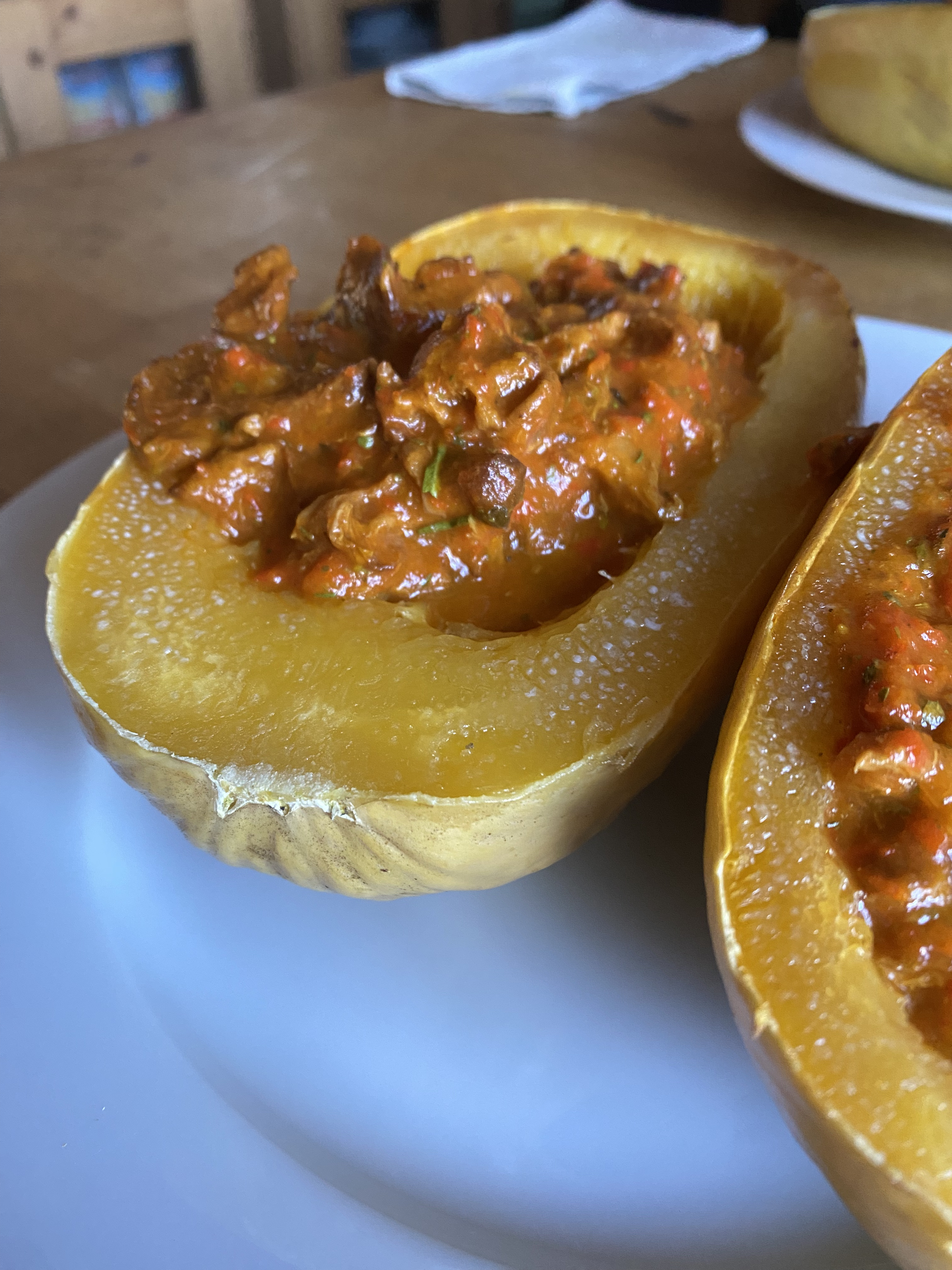 Gestern kamen zwei davon dann auf den Tisch: halbiert, entkernt, mit etwas Öl eingepinselt und mit der Schnittfläche nach unten aufs Blech gelegt. Bei 200 Grad etwa eine halbe Stunde im Ofen – und schon ist das goldene Fruchtfleisch perfekt gegart.