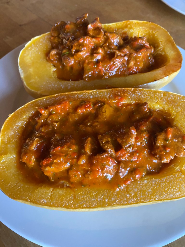 Dazu gab’s eine würzige Soße aus Paprika und Eierschwammerln, kräftig abgeschmeckt und kurz vor dem Servieren in den Kürbishälften verteilt.