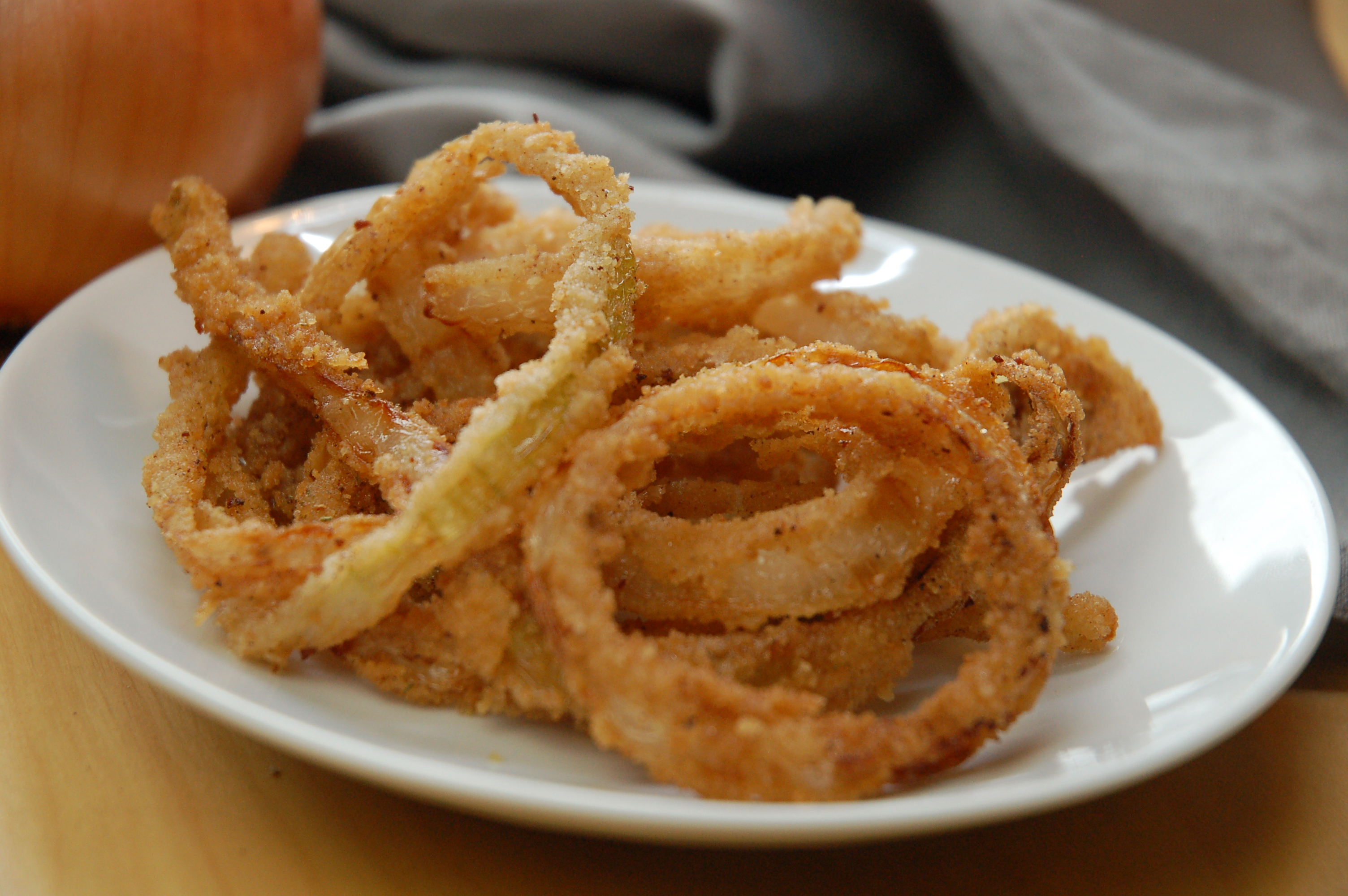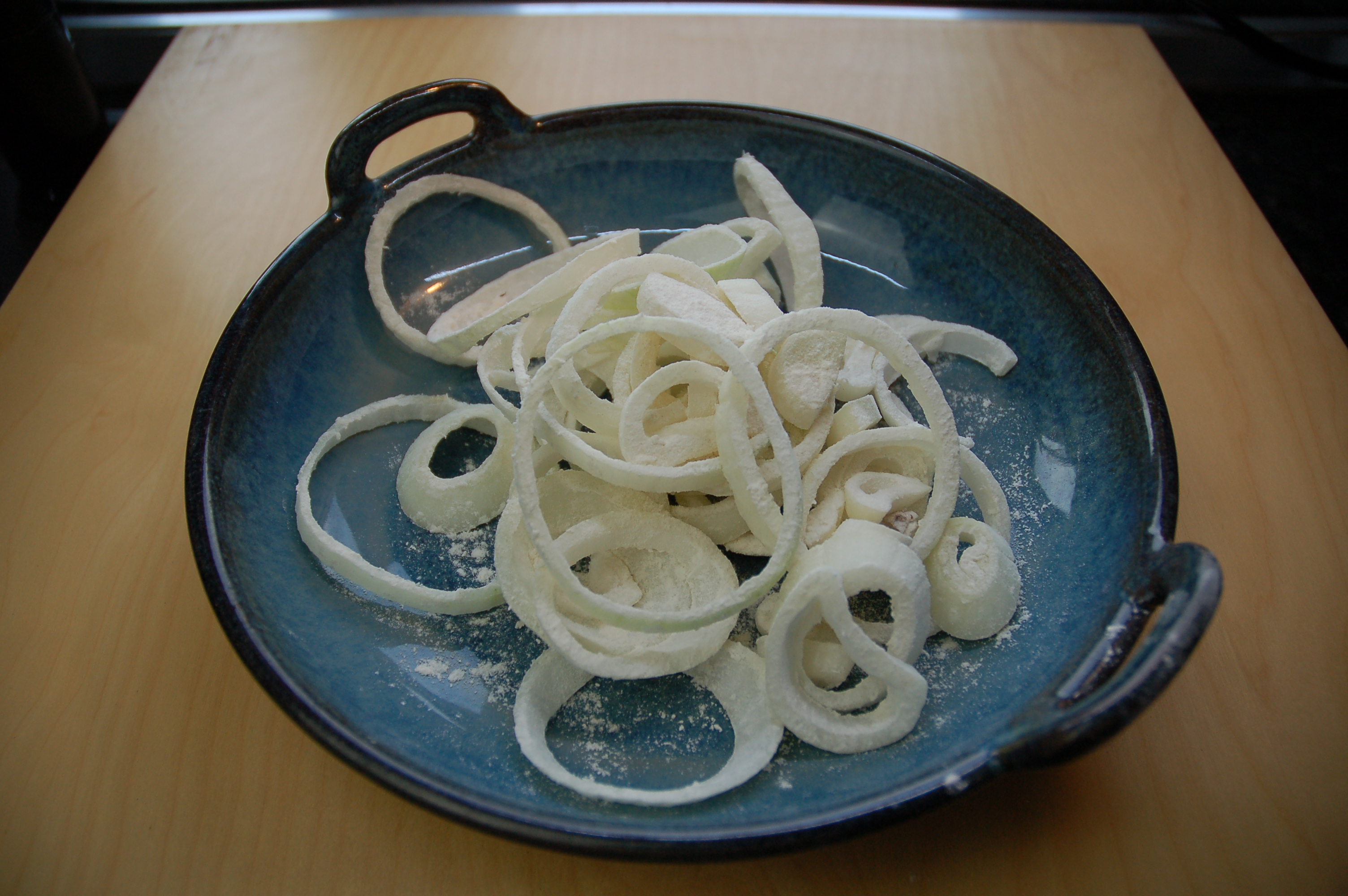 - Zwiebel in Ringe schneiden (nicht zu dünn, sonst verbrennen sie beim Rausbacken).