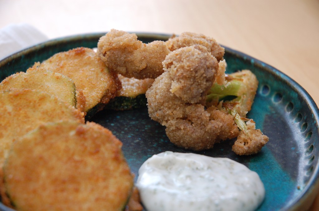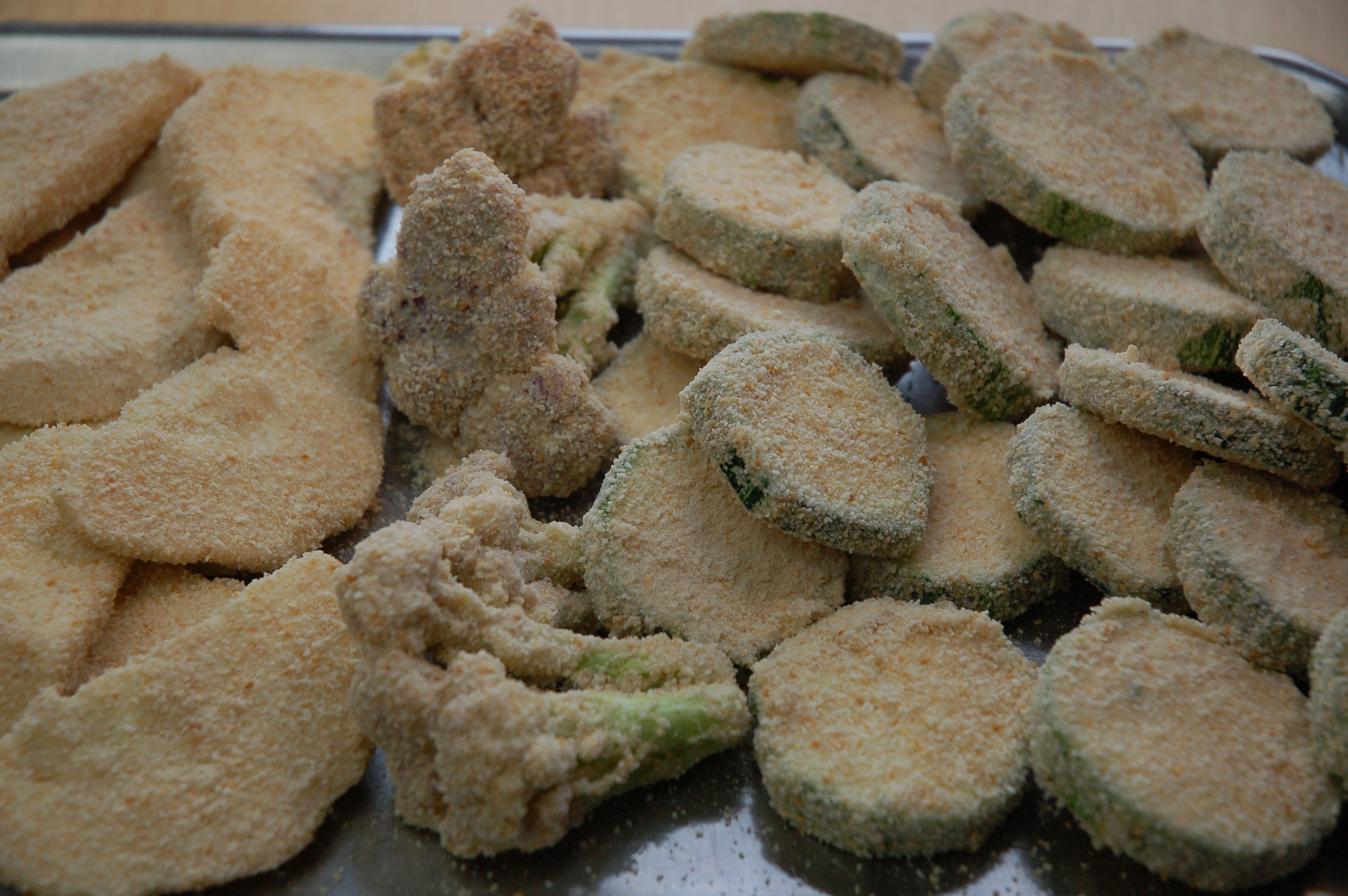- Gemüsestücke zuerst im Weizenmehl wenden, dann in die Hafersahne tauchen und zuletzt in den Semmelbröseln wälzen.