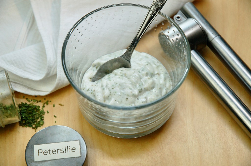 - Joghurt, Mayonnaise, Verjus, Knoblauch und Kräuter verrühren.